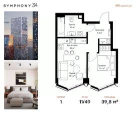 Дом сдан. Ключи в день покупки! В продаже 1-комнатная квартира площадью 41 м² с предчистовой отделкой на 10 этаже 49 этажного дома в корпусе Кристал. ЖК Симфония 34 - концептуально новый жилой комплекс премиум-класса с подземной парковкой, состоит из четырех башен высотой 36 - 54 этажа. Квартиры сдаются с базовой (предчистовой) отделкой MR BASE или дизайнерской чистовой отделкой MR READY. Высота потолков 3 - 6 метров, окна высотой до 2,6 м. Более 100 кладовых в подземной части ЖК и более 500 на этажах. Безопасность - Система контроля входа на территорию комплекса, биометрия - Система автоматического водяного пожаротушения и противопожарного водопровода, система пожарной вентиляции - Доступ на парковку при помощи системы распознавания автомобильных номеров, карточка для контроля доступа резидентов - Система видеонаблюдения - Круглосуточная связь через приложение, телефон, голосовые сообщения с охраной, консьержем, call-центр. Расположение Пешком - 6 минут до метро "Дмитровская" - 15 минут до Тимирязевского парка На машине - 5 минут до Савеловского вокзала и Аэроэкспресса в Шереметьево - 10 минут до Москва-Сити и Садового кольца Благоустройство - 70% территории отведены под зеленые насаждения и ландшафтный дизайн - Приватный Японский сад - Детские площадки с зонированием по возрасту - Clubhouse для резидентов - Wellness & SPA - Зона для пикника, зона с гамаками - Центральное лобби, ресторан, коммерческие помещения - Дополнительный вход/выход на территорию комплекса Окружение - В 10 минутах от Symphony 34 находится дизайн-завод Flacon, где регулярно проходят культурно-образовательные и развлекательные мероприятия - Тимирязевский парк расположен в 850 м. Площадь парка 232 га - Рядом расположен парк "Дубки", площадью 16,5 га. - В 15 минутах расположен Хлебозавод 9. Здесь находятся шоурумы брендов, кафе разных кухонь мира, образовательные проекты и площадки для мероприятиКомпания MR предлагает своим клиентам специальные условия приобретения квартир в рамках программ ипотечного кредитования от банков-партнеров. Продам 1-комнатную квартиру с отделкой в готовой новостройке в Москве.