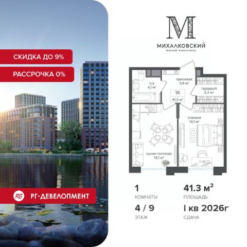 Ипотека для каждого! Полная стоимость кредита от 11,578% до 22,490%. Ставка от 0,11% в АО "Альфа-Банк" фиксируется на 1 год с даты заключения кредитного договора, далее полная стоимость кредита от 25,819% до 28,767% ставка 21,59% до окончания срока кредитования. Первоначальный взнос — от 20% от стоимости квартиры. Срок кредитования — от 3 до 30 лет. Скидка 9% при покупке квартиры! Цена указана с учетом максимального размера скидки. Продаётся 1-к квартира 40,8 кв.м. в ЖК "Михалковский" на 2-м этаже 9 этажного дома. Компания "РГ-Девелопмент" предоставляет скидки на квартиры в жилом комплексе. Акция действительна с 12.09.2024 г. до 30.11.25г. включительно. Чтобы воспользоваться предложением, необходимо подписать договор на приобретение недвижимости до 30.11.25г., включительно. Действует программа "Растет семья - растет и квартира". Прямая продажа от застройщика! Старт продаж новых корпусов. Квартиры без отделки. Срок сдачи 1 кв. 2026 г. Особенности проекта: Завораживающие виды Красивое благоустройство Уникальная локация для Москвы (рядом Головинский парк, пруды, усадьба Михалково) Рядом с центром В проекте присутствует: архитектура голландского бюро MLA+, зеленые зоны, транспортная доступность, благоустроенная территория, подземный паркинг, детский сад и выход на Головинский парк с пятью прудами. Название комплекса указывает на одну из его черт - соседство с имением Михалково. Позвольте себе жить в месте, где проводили свой досуг династии Дашковых и Паниных. Продается 1-комнатная квартира в ипотеку в новостройке в районе Головинский в Москве.