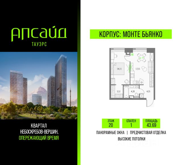 Продаётся 1-комнатная квартира площадью 37.53 кв.м на 7 этаже 46 этажного корпуса Монте Бьянко в квартале небоскребов "Апсайд Тауэрс". Квартира с чистовой отделкой, c видом на Внутренний двор, корпус Эверест , корпус Атлас, корпус Олимп, Ландшафтный парк. Номер квартиры Г0712.