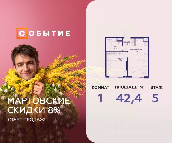 Весь март - скидка до 8% действует до 31.03.2026 г. при 100% оплате и не субсидированной ипотеке! В продаже 1-к квартира от застройщика. Общая площадь 45.9, жилая 27.9, кухня 18. Квартира расположена на 2 этаже жилого квартала "Событие-6", корпус 1, Секция 1. Квартира без отделки. Срок сдачи: 4 кв. 2029 года. СОБЫТИЕ.6 — финальный дом парк-квартала СОБЫТИЕ на Мосфильмовской. Переезжайте в уже сформированный квартал с готовой инфраструктурой и парком! Премиальный жилой комплекс в престижном районе Москвы предлагает стильную архитектуру, продуманное благоустройство и великолепно разнообразие общественных пространств. Свой парк прямо возле дома! Архитектура Архитектура СОБЫТИЯ.6 выполнена в ультрасовременном стиле московским бюро Atrium на основе дизайн-кода британских архитекторов LDA Design и UHA London. Дом отличает оригинальная геометрия фасадов, большое остекление и высокие лобби (до 6,2 м) с авторской мебелью и светильниками. Расположение Мосфильмовская улица (Раменки) — один из престижных районов Москвы. Близость к историческому и деловому центру, природным зонам Запада столицы. Транспортная доступность: • 10 мин до Москва-Сити и ТТК; • 15 мин до Садового кольца; • 25 мин до аэропорта Внуково; • 7-10 мин до станций метро "Аминьевская" и "Мичуринский проспект". Инфраструктура: • парк "Событие" (12 га, финалист конкурса Правительства Москвы) с беговыми (1,5 км) и велодорожками (2,7 км), экотропой (1,6 км), площадками, лекторием; • школа, детский сад, магазины, салоны красоты, рестораны (к моменту заселения); • мультидвор с игровыми и спортивными площадками, мини-бульваром; • общественная терраса на 10-м этаже (коворкинг, лаунж); • Закрытые общественные пространства: детская комната, спортивный зал, коворкинг, лаунж-зоны. Паркинг 256 мест для жителей (48 — для электромобилей), 24 гостевых (5 — для электромобилей), мойки колес, кладовые, зоны для велосипедов. Окружение Парки и заповедники (Воробьёвы горы, Матвеевский лес и др.), МГУ, театр им. Н. И. Сац, стадион "Лужники". Безопасность Видеонаблюдение, контроль доступа, видеодомофоны, консьерж-сервис 24/7, системы пожарной безопасности и мультисервисная оптическая сеть.