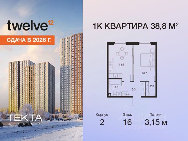 Рассрочка 0% с платежом от 120 000 ₽ в месяц. Сдача уже в 2026 году 1-комн. квартира в ЖК "Твелв" на 7 этаже в 28 этажном здании Корпус 3. Общая площадь: 39.7 кв.м., жилая: 13.20 кв.м. Высота потолков 3.00 м. ЖК Твелв от застройщика Текта Групп — это новый уровень жизни в районе Нагорный в 3-х минутах от станции метро. Проект представляет собой воплощение современной концепции комфортной жизни, где функциональность органично сочетается с эстетикой. Архитектура Твелв создает атмосферу, вдохновляющую на успех и располагающую к позитивным эмоциям. Дом, в котором каждый день будет наполнен уютом, а не рутинной работой и дорожными пробками. Твелв предлагает своим жильцам продуманные планировки, возможность объединения квартир, а также увидеть красоту города через угловое остекление увеличенных окон. Особое внимание уделено комфорту жителей: благоустроенная территория, зеленые насаждения, детские площадки, парковка. ЖК Твелв — это больше, чем просто жилье: это атмосфера умиротворенности, комфорта и гармонии.