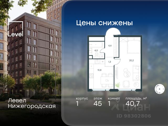 Цена указана с учётом скидки при 100%-й оплате, несубсидированной ипотеке, рассрочке (кроме программы "Рассрочка 0%"). В активно развивающемся районе на юго-востоке столицы продается 1-комнатная квартира площадью 40,7 кв.м без отделки.. Квартира расположена на 45 этаже 45-этажного этажного корпуса 1 в жилом комплексе комфорт-класса Левел Нижегородская (компания Level Group/Левел групп). Отличная транспортная доступность - 10 мин. пешком до станции метро, МЦД-4, БКЛ и МЦК "Нижегородская"; - 13 мин. пешком до станций метро "Андроновка" и "Перово"; - 10 мин. на авто до ТТК; - 14 мин. на авто до Садового кольца. Благоустройство Благоустроенная территория комплекса делится на внешнюю и внутреннюю. Внутренняя часть - это закрытый двор 0,9 га, где обустраиваются детские площадки для разных возрастных групп, беседки для отдыха и работы, несколько спортивных зон, включая зоны для уличных тренировок и лужайку для бадминтона. Здесь же появится ухоженный луг с прогулочными маршрутами. Рядом с жилым комплексом будет создан ландшафтный парк площадью 2,4 га. В парке будут высажены высокие деревья, луговые травы и кустарники, благоустроены лаунж-зоны у пруда, дорожки для бега и прогулок. В центре парка предусмотрена событийная площадь, рядом расположатся дополнительные спортивные и детские площадки, а также зона для выгула домашних питомцев. Внутренняя инфраструктура Дома жилого комплекса будут оснащены коммерческими помещениями, где откроются все необходимые сервисы: магазины, аптеки, салоны красоты, кофейни, службы доставки и многое другое. Комфорт - это когда всё рядом. Кроме того, на территории жилого комплекса Левел Нижегородская предусмотрен подземный отапливаемый паркинг. Этап 1 включает 335 машино-мест и 143 кладовых помещения для хранения сезонных вещей. Технологии и безопасность На территории всех общественных зон постоянно ведется видеонаблюдение и предусмотрен высокоскоростной вайфай. Подъезды, паркинг и внутренний двор оснащены системой контроля доступа. Для удобства жителей создано мобильное приложение, позволяющее связаться с управляющей компанией, осуществлять удаленное управление видеодомофоном или просмотреть изображение отдельных видеокамер по заявке. Для безопасного перемещения по этажам и комфортного спуска в паркинг будут установлены современные лифты от компании BLT Brilliant Elevator. Скорость лифтов - 1,6 - 2,5 м/с. Особенности - Архитектура от экспертов из бюро ARCH(E)TYPE; - Разноуровневая застройка - от секций средней этажности до высоток в 45 этажей (этап 1); - Окна шириной до 2,2 метров (этап1) с видами на Останкинскую башню, Измайловский парк, "Москва-Сити" и Кусковский лесопарк; - Лобби с окнами в пол и потолками от 3,4 метров, оснащенные консьерж-сервисом; - Более 35 видов планировок, включая редкие форматы. Артикул 1-511.