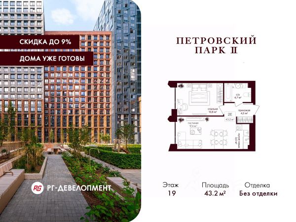 Продаётся 1-комнатная квартира 43,9 кв.м. в ЖК "Петровский парк II" на 2-м этаже 24 этажного дома. Скидка 9% при покупке квартиры! Цена указана с учетом максимального размера скидки. Компания "РГ-Девелопмент" предоставляет скидки на квартиры в жилом комплексе. Акция действительна с 01.11.2025г. до 30.11.2025г. включительно. Для того чтобы воспользоваться предложением, необходимо подписать договор на приобретение недвижимости до 30.11.2025г., включительно. ЖК "Петровский парк II" расположен в историческом районе Москвы, в 5 минутах от парка и станции метро "Динамо". Архитектуру от Syntaxis характеризуют асимметричные фасады, геометрические выступы, напоминающие волны. Эстетика архитектурных форм продолжается в интерьере внутренних пространств - двух центральных лобби и входных группах. На закрытой территории зеленые зоны с цветниками, места для отдыха, спортивные и игровые площадки. Подземная парковка, близость основных магистралей и удобные выезды, которые дают возможность жителям комплекса быть в центре культурной и общественной жизни. Комфортной жизни на территории комплекса расположены магазины, рестораны, частный детский сад. 1-комнатная квартира в ипотеку в новостройке рядом с метро Петровский Парк.