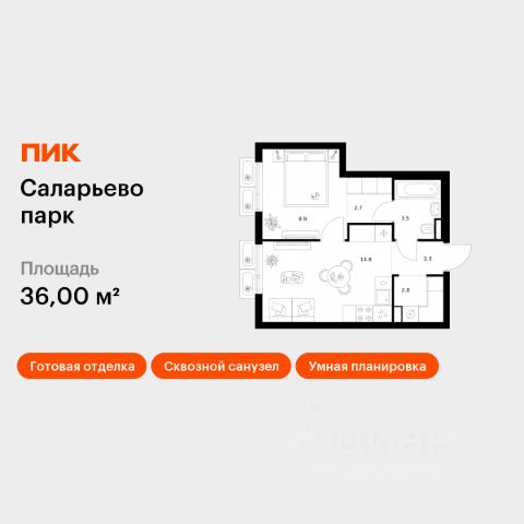 Продаётся 1-комн. квартира площадью 34,3 кв.м на 7 этаже 14 этажного дома (Корпус 69.5, Секция 5) проекта ПИК Саларьево парк. Светлый просторный подъезд на уровне земли, функциональная планировка, большие окна, предчистовая отделка. Жилой район "Саларьево парк" расположен в Новой Москве, в четырёх километрах от МКАД по Киевскому шоссе. Две станции метро: "Саларьево" и "Филатов луг", — находятся в пешей доступности от проекта. Дойти до них можно за 5-10 минут. В квартале уже создана качественная среда, где есть абсолютно всё для полноценной жизни, работы и отдыха. Благодаря удобному расположению проекта всё важное будет рядом: детские сады, школы, кафе и рестораны, шопинг в торговых центрах, фитнес и даже аэропорт. Все корпуса в квартале гармонично сочетаются, образуя единую городскую среду. Между собой их объединяет невысокая этажность и натуральная цветовая гамма. Здесь приятно гулять и проводить время на улице всей семьёй. В "Саларьево парке" создана уникальная образовательная среда, включающая в себя шесть школ, рассчитанных на 6 250 учеников. Две из них уже открыты, их посещает 2 300 детей. Также на территории "Саларьево парка" находится 12 детских садов, один из которых с бассейном. Сейчас уже открыты 7 садов. В "Саларьево парке" открыта уникальная игровая площадка — ПлейХаб "Оригами". Здесь есть ручей, горка-труба и рельефные холмы. Взрослые смогут отдохнуть в уютном кафе, пока дети играют. Также на территории проекта есть СпортХаб — большая спортивная зона, разделённая по интересам и возрастам. Здесь можно заниматься разными видами спорта: футболом, баскетболом, волейболом и стритболом. Зимой центральную часть площадки превращают в каток. Во дворах-парках жилого квартала есть места для отдыха, детские и спортивные площадки. На первых этажах домов расположены магазины, кафе и полезные сервисы. Также вблизи проекта есть несколько масштабных торговых центров. До ТЦ "Саларис" пять минут пешком. Артикул 1023976 (Застройщик ООО "Специализированный Застройщик "Тирон")