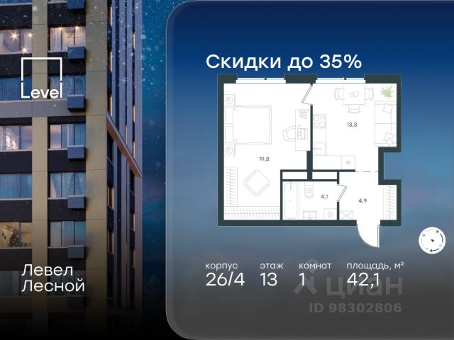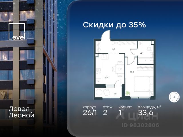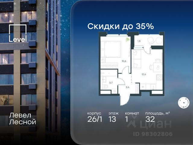 Цена указана с учётом скидки при 100%-й оплате, несубсидированной ипотеке, рассрочке (кроме программы "Рассрочка 0%"). В районе, утопающем в густой зелени лесов, многочисленных парков и скверов, продаётся 1-комнатная квартира площадью 43.00 кв.м без отделки. Квартира расположена на 14 этаже в жилом комплексе комфорт-класса Левел Лесной (компания Level Group/Левел групп). Отличная транспортная доступность: - 25 мин. пешком до станции метро "Пятницкое шоссе"; - 28 мин. на автобусе до станции метро и МЦД-2 "Волоколамская"; - 11 мин. на авто до МКАД; - 25 мин. на авто до ТТК. Продуманный архитектурный проект: - Концепция проекта Левел Лесной от бюро СПИЧ; - Высотность комплекса до 15 этажей с уникальными видами на лесные массивы и город; - Высота потолков до 3 м; - Современные окна высотой до 1,6 м, в части квартир предусмотрены окна в пол. Высота подоконников 0,6 м; Расположение: Жилой комплекс Левел Лесной строится в зелёной зоне ближайшего Подмосковья, г.о. Красногорск в посёлке Отрадное. Шаговая и автомобильная доступность до метро и больших транспортных артерий города. За 25 минут вы дойдёте до станции метро "Пятницкое шоссе", а за 20 минут на машине сможете доехать до станции метро "Тушинская". Район окружен роскошной зеленью лесов и парковых зон, занимающих территорию свыше 1 000 гектаров. Помимо благоприятной экологии, здесь множество возможностей для активного отдыха и поддержания физической формы. Облагороженная территории с полностью развитой инфраструктурой. На территории проекта находится детский сад и школа "Светлые Горы", которая входит в список лучших частных школ от Forbes Education (по данным на 2023г.). Кроме того, в пешей доступности расположено ещё 8 детских садов, а также запланировано открытие современной муниципальной школы. В непосредственной близости находятся сетевые супермаркеты и локальные магазины, аптеки, клиники, почта, библиотека, салоны красоты, рестораны, спортивные и творческие секции, развивающие детские центры. В 12 минутах пешком расположен торговый парк "Отрада" с продуктовым и строительным гипермаркетами, магазинами, кинотеатром и развлечениями для детей. Внутренняя инфраструктура: Мы знаем, как важно, чтобы магазины и сервисы были всегда рядом. В сданных корпусах жилого комплекса Левел Лесной уже расположена полностью готовая развитая инфраструктура. На первых этажах корпуса 27 предусмотрено ещё 14 коммерческих помещений. Благоустройство: Продуманное пространство и аура приватного европейского городка рождают чувство лёгкости и расслабления у каждого, кто попадает на территорию проекта. Концепцию общественных площадок разработали в партнёрстве два архитектурных бюро: Highlight Architecture и SCAPE. В безопасных дворах без машин каждый обязательно найдёт себе место для вдохновения, отдыха и спорта.