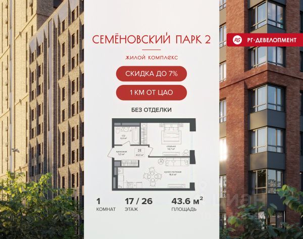 Ипотека для каждого! Полная стоимость кредита от 12,380% до 18,537%. Ставка от 0,11% в АО "Альфа-Банк", ген. лицензия ЦБ РФ 1326 от 16.01.2015. Ставка фиксируется на первые 12 месяцев, далее полная стоимость кредита от 22,022% до 24,599% ставка 21,59%. Первоначальный взнос — от 20,1% от стоимости квартиры. Срок кредитования — от 4 до 30 лет. Ипотека на весь срок! Полная стоимость кредита от 23,396% до 26,058% со ставкой 14,5%! Первоначальный взнос —от 20,01% от стоимости квартиры. Срок кредитования — от 3 до 30 лет. АО "Банк ДОМ.РФ" универсальная лицензия Банка России 2312 от 19.12.2018. Скидка 7% при покупке квартиры! Цена указана с учетом максимального размера скидки. Продается 1-к квартира 41,9 кв.м. в ЖК "Семеновский парк 2" на 8-м этаже 12 этажного дома. Компания "РГ-Девелопмент" предоставляет скидку на квартиры в жилом комплексе. Акция действительна до 31.03.2026 включительно. Чтобы воспользоваться предложением, необходимо подписать договор на приобретение недвижимости до 31.03.2026 включительно. Компания "РГ-Девелопмент" вошла в ТОП-10 девелоперов по объёму введённого жилья в "Старой Москве" по итогам 2025 года. Прямая продажа от застройщика! Квартиры без отделки. Срок сдачи корпуса - 1 кв. 2026 г., корпус сдан. Выдача ключей. ЖК "Семеновский парк 2" - это идеальное место для того, чтобы стать вашим домом. Проект расположен в исторической части Москвы вблизи Измайловского лесопарка, в 1 км от ЦАО. 4 станции метро отделяют вас от Красной площади и 15 минут на автомобиле - от Садового кольца.