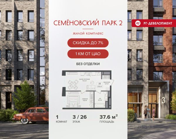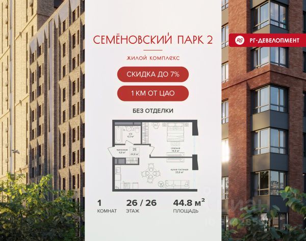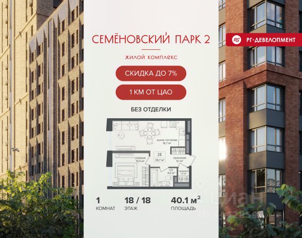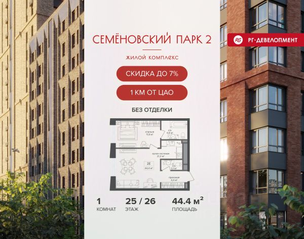 Ипотека для каждого! Полная стоимость кредита от 12,380% до 18,537%. Ставка от 0,11% в АО "Альфа-Банк", ген. лицензия ЦБ РФ 1326 от 16.01.2015. Ставка фиксируется на первые 12 месяцев, далее полная стоимость кредита от 22,022% до 24,599% ставка 21,59%. Первоначальный взнос — от 20,1% от стоимости квартиры. Срок кредитования — от 4 до 30 лет. Ипотека на весь срок! Полная стоимость кредита от 23,396% до 26,058% со ставкой 14,5%! Первоначальный взнос —от 20,01% от стоимости квартиры. Срок кредитования — от 3 до 30 лет. АО "Банк ДОМ.РФ" универсальная лицензия Банка России 2312 от 19.12.2018. Скидка 7% при покупке квартиры! Цена указана с учетом максимального размера скидки. Продается 1-к квартира 41,9 кв.м. в ЖК "Семеновский парк 2" на 8-м этаже 12 этажного дома. Компания "РГ-Девелопмент" предоставляет скидку на квартиры в жилом комплексе. Акция действительна до 31.03.2026 включительно. Чтобы воспользоваться предложением, необходимо подписать договор на приобретение недвижимости до 31.03.2026 включительно. Компания "РГ-Девелопмент" вошла в ТОП-10 девелоперов по объёму введённого жилья в "Старой Москве" по итогам 2025 года. Прямая продажа от застройщика! Квартиры без отделки. Срок сдачи корпуса - 1 кв. 2026 г., корпус сдан. Выдача ключей. ЖК "Семеновский парк 2" - это идеальное место для того, чтобы стать вашим домом. Проект расположен в исторической части Москвы вблизи Измайловского лесопарка, в 1 км от ЦАО. 4 станции метро отделяют вас от Красной площади и 15 минут на автомобиле - от Садового кольца.