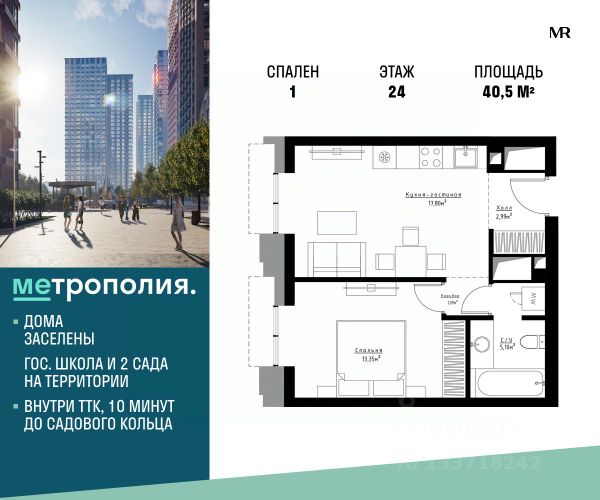 Продаётся 1-комнатная квартира общей площадью 40.60 м², на 19 этаже. Корпус сдан. 1 очередь застройки состоит из 7 сданных корпусов по 30 этажей. Метрополия - это город городов. Коллекция лучших решений из самых прогрессивных мегаполисов планеты. Для тех, кому комфортно в любой точке мира. Все корпуса выполнены в своем индивидуальном стиле и получили свои названия в честь мировых метрополий. Эта концепция сохраняется и в дизайнерских лобби, которые выполнены в едином стиле с детальной проработкой декора и использованием характерных для каждого мегаполиса материалов. Высотные здания "Метрополии" образуют благоустроенное дворовое пространство на 4,6 га, которое украсят более 400 деревьев и несколько сотен кустарников, живописные цветочные клумбы и аккуратные газоны. Территория комплекса продумана до мелочей: - Запланировано строительство государственной школы, а также 2 частных и одного государственного детских садов; - Сформированы несколько тематических зон; - Предусмотрено место для спокойного отдыха с кафе; - Зона активности для сторонников здорового образа жизни с тренажерами для воркаута и площадкой для стритбола и петанка. Детские площадки разделены по возрастам от малышей до подростков, на всех площадках используется оборудование европейского производителя, уложено резиновое покрытие, которое позволяет детям играть в полной безопасности. Современные инженерные решения не оставят вас равнодушными: - Скоростные и бесшумные лифты; - Пожарная и охранная сигнализация; - Система навигации с ночной подсветкой по всей территории комплекса; - Wi-Fi-покрытие в зоне лобби и по всей территории комплекса; - Система распознавания лиц для доступа на территорию ЖК; - Система контроля и учета энергоресурсов; - Контроль доступа на парковку по системе считывания номеров.