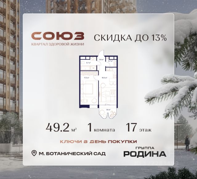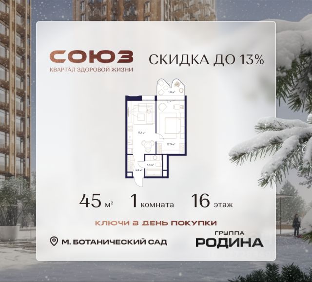 Рассрочка 0% Продаётся 1-комнатная квартира площадью 48 м² на 16 этаже в Жилом Комплексе "Союз". Квартал здоровой жизни премиум-класса с рекордным количеством олимпийских видов спорта: - Ледовая арена для хоккея и фигурного катания, - Футбольные поля для тренировок, - Спортивный зал для фехтования, - Бассейн на 6 дорожек, - Центр единоборств, - 4 крытых площадки для настольного тенниса, - 7 теннисных кортов (крытых и открытых), - 4 крытых площадки для сквоша, - Легкоатлетический стадион, - Площадки для баскетбола и волейбола. Уникальные форматы квартир с мастер-спальнями, приватными террасами, балконами, а также пентхаусы с открыточными видами на город. Все квартиры продаются с отделкой Shell&Core и панорамным остеклением. Расположение Пешком: - 2 мин. до парка "Сад Будущего"; - 6 мин. до ст. м. "Ботанический сад"; - 6 мин. до ст. МЦК "Ботанический сад"; - 6 мин. до парка "Леоновская роща"; На автомобиле: - 2 мин. до СВХ (МСД); - 5 мин. до Проспекта Мира; - 10 мин. до ТТК; - 15 мин. до Садового кольца; - 25 мин. до аэропорта "Шереметьево". Благоустройство - собственная спортивная инфраструктура 7 Га; - зона для пикников; - игровые и спортивные площадки для детей всех возрастов; - розарий, а также сосновые, каштановые и дубовые аллеи; - площадки под открытым небом для занятий спортом и йоги; - игровые комнаты для детей; - лаунж-зона для резидентов; - просторная переговорная для деловых встреч; - премиальный ресторан "Шабада" Сосо Павлиашвили с водными арт-объектами на прогулочной аллее, садом ароматных трав и сценой под открытым небом; - кафе, химчистки, аптеки и супермаркеты рядом с домом. Окружение - 8 парков: Сад Будущего, Леоновская роща, Хуамин, Главный ботанический сад РАН, Шереметьевская дубрава, Останкино, парк спорта "Яуза", пойма реки Яуза и музей-усадьба "Останкино"; - 3 ВУЗа: ВГИК, РГСУ, МГПУ; - 12 школ, в том числе: школа 1499 им. И.А. Докукина (топ 100), Brookes Moscow, IThub школа; - 18 детских садов, в том числе билингвальный ALERTUM KIDS; - один из крупнейших океанариумов Европы "Москвариум"; - один из крупнейших в Европе торгово-развлекательных центров "Европолис". 1-комнатная квартира в ипотеку в новостройке в районе Ростокино в Москве.