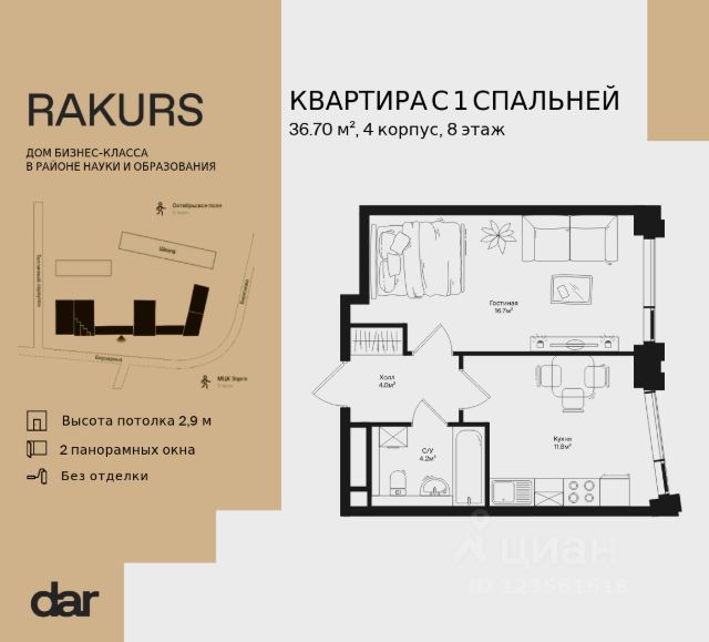 Продаётся 1-комнатная квартира 36.30 м² в жилом комплексе Ракурс. Квартиру отличают панорамное остекление, улучшенная шумо и воздухоизоляция. Дом сдаётся в 1 квартале 2028 года, продажи проходят через эскроусчета. Подземный паркинг, коворкинг, закрытая благоустроенная территория с фонтаном и артобъектами. Гибкие условия покупки.