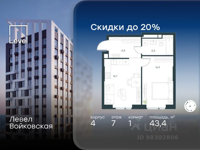 Цена указана с учётом скидки при 100%-й оплате, несубсидированной ипотеке, рассрочке (кроме программы "Рассрочка 0%"). Продается 1-комнатная квартира площадью 40.90 кв. м с отделкой. Квартира находится на 5 этаже 26-этажного корпуса 4, в новом жилом комплексе бизнес-класса Левел Войковская, расположенном рядом с живописным заповедником "Покровское-Стрешнево" (застройщик - компания Level Group/Левел групп). Прекрасная транспортная доступность - 7 мин. пешком до станции МЦК "Балтийская"; - 15 мин. пешком до станции метро "Войковская"; - 8 мин. на машине до ТТК; - 15 мин. на машине до центра Москвы; - 20 мин. на машине до Москва-Сити. Продуманный архитектурный проект - стильная архитектура от мастерской Фефелова В. В.; - панорамные виды на парки, Химкинское водохранилище и Останкинскую башню; - лобби с высотой потолков до 6,45 метров; - более 20 видов планировок, включая редкие форматы квартир с террасой и увеличенной высотой потолков до 5,42 метров; - 2 варианта дизайнерской отделки в корпусе 4 как дополнительная опция к предчистовой отделке: стиль Модерн в светлых холодных тонах и стиль Классик в нейтральной бежевой гамме. Квартиры в корпусах 3 и 5 сдаются без отделки. Расположение Жилой комплекс Левел Войковская строится в престижном Северном округе Москвы, где развитая инфраструктура и живописная природа переплетаются в единый ансамбль. Войковский район окружают парки и набережные. В шаговой доступности - парк "Покровское-Стрешнево", не более 15-ти минут на велосипеде занимает путь до Тимирязевского парка и 9-ти минут до парка усадьбы Михалково. Рядом более 60 школ, 75 дошкольных учреждений, 17 государственных и 6 частных вузов, 25 супермаркетов, 4 торговых центра, среди которых ТЦ "Метрополис" и ТЦ "Авиапарк". Внутренняя инфраструктура На территории жилого комплекса предусмотрены коммерческие помещения: кафе, ресторан, пекарня и другие сервисы на первых этажах корпусов. Для жителей будет доступен отапливаемый подземный паркинг на 244 машино-места с доступом с любого этажа на лифте. На территории паркинга будет расположено 125 кладовых помещений для хранения сезонного инвентаря. Лобби и благоустройство Дизайн лобби жилого комплекса Левел Войковская создан совместно с бюро "Бланк Архитектс" (Blank Architects). Теплая цветовая гамма, ресепшен, зоны ожидания, лапомойки и гостевые санузлы - каждая деталь превращает лобби в комфортное продолжение вашего дома. 1,15 га площади в первых двух этапах строительства отведено под приватный внутренний двор, который спроектирован совместно с бюро "Правда". Детские площадки для всех возрастов, спортивные пространства для йоги, уличных тренировок и петанка, уютные зоны для тихого отдыха или работы. Здесь утро начинается с вдохновения, а вечер наполнен приятными моментами. Лифты Комфортное перемещение внутри жилого комплекса обеспечат надёжные лифты с доступом в паркинг с жилых этажей. В каждом корпусе предусмотрено по 3 грузопассажирских лифта.