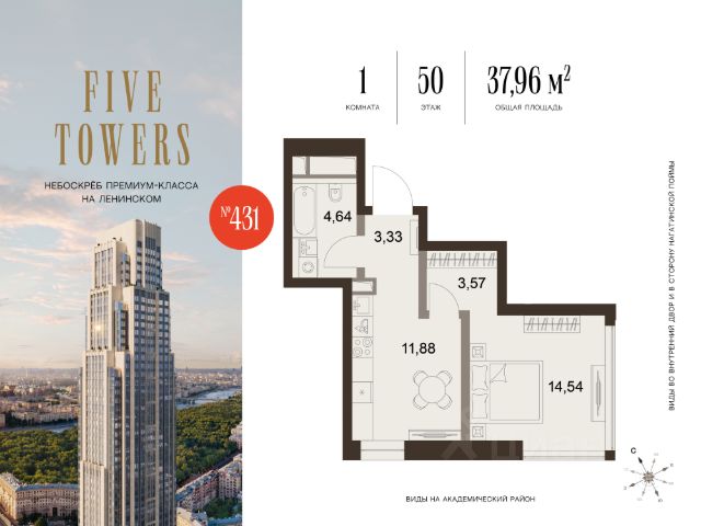 Гибкие программы рассрочки: 0% без переплат и удорожания; первый взнос от 10%. • Уникальная, нетипичная планировка с детально продуманными функциональными зонами • Просторная прихожая с гостевым санузлом, отделяющая входную группу от основной части квартиры • Большая кухня-гостиная с тремя панорамными окнами • Приватная мастер-спальня площадью почти 20 кв. м с двумя панорамными окнами • Просторная ванная комната с окном в мастер-спальне О проекте FIVE TOWERS — первый жилой небоскрёб на Ленинском проспекте и самый высокий дом столицы за пределами делового кластера "Москва-Сити". Премиальный небоскрёб представляет собой ультрасовременное, высокотехнологичное здание, идеальный синтез стилей культовых высоток Москвы и небоскребов Нью-Йорка и поражает воображение уникальными видами, монументальной роскошью и совершенством форм. Величественная панорама, открывающаяся из окон вашей квартиры, завораживает: легендарные сталинские высотки, шпиль главного корпуса МГУ, "Москва-Сити", спорткомплекс "Лужники". Окружение 75-этажный жилой комплекс премиум-класса расположен в историческом Донском районе. Транспортная инфраструктура проекта сделает жизнь резидентов FIVE TOWERS комфортной и продуманной: удобные выезды на ТТК и Садовое кольцо, 10 минут до метро "Ленинский проспект", 11 минут на МЦК до Москва-Сити. Рядом расположены крупные деловые и бизнес-центры, а в шаговой доступности — 500 га парков, образуемых Музеоном, Парком Горького и парком "Воробьевы горы". Инфраструктура Архитектурное бюро Олега Клодта разработало дизайн общественных пространств FIVE TOWERS: гранд-лобби, камерную библиотеку c камином и лифтовую зону. Все необходимые сервисы сосредоточены на первых этажах небоскрёба: кафе, винотека, салон красоты, фитнес и детский клуб. Приватный Sky Club 49 — респектабельный лаундж с открытой террасой и ограниченным доступом на 49 этаже — только для резидентов. Квартиры в FIVE TOWERS Все квартиры в FIVE TOWERS будут сданы с предчистовой отделкой (white box). Это позволит будущим резидентам комплекса сосредоточиться на творческой части ремонта, не связанной с организацией черновых работ. В жилом небоскребе FIVE TOWERS запланировано 596 премиальных квартир и 87 типов планировочных решений, которые можно адаптировать под личные запросы и сценарии проживания. В комплексе премиум-класса представлены не только двух- и трехкомнатные квартиры с угловым остеклением, но и однокомнатные с видом на две стороны и трехкомнатные квартиры с видами на три стороны, что является редким предложением на рынке недвижимости.