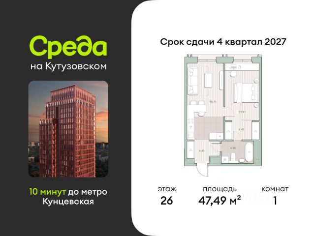 О квартире Продаётся однокомнатная квартира общей площадью 33.98 кв. м. с отделкой на выбор: черновая, White Box. Квартира на 16 этаже корпуса 5 в жилом комплексе бизнес-класса "Среда на Кутузовском". До метро "Кунцевская" 10 минут пешком. Исторический зелёный район "Среда на Кутузовском" строится в Кунцево - историческом и экологически чистом районе Москвы. Здесь нет крупных производств, много лесных массивов и роза ветров, которая обеспечивает приток чистого воздуха. Район наполнен жизнью и уже развит: много детских садов и школ, поликлиники, магазины, кафе, спортивные объекты, парки. - 10 минут пешком до станции метро "Кунцевская". - 5-8 минут на машине до Кутузовского проспекта и Можайского шоссе и 10-15 минут до Рублёвского и МКАД. - 15 минут езды до Крылатских холмов, Суворовского парка и заказника "Долина реки Сетунь". О жилом комплексе "Среда на Кутузовском" - новый квартал с башнями от 12 до 44 этажей, окружённый лесными массивами и историческими усадьбами старой Москвы. Во внутреннем дворе есть водоём, многоуровневые зоны с детскими и спортивными площадками, коворкинг на свежем воздухе и локации для уединённого отдыха. Особенности - Архитектура с многослойными фасадами. - Квартиры с террасами и мастер-спальнями. - Окна в пол на всех этажах. - Общественные лаунж-гостиные. - Собственный ландшафтный парк во дворе. - Зоны барбекю и площадки для отдыха у воды. - Умный подземный паркинг. - Стрит-ритейл на первых этажах. 1-комнатная квартира в новостройке в районе Кунцево в Москве.