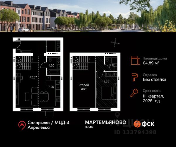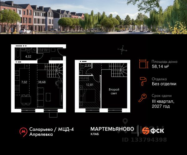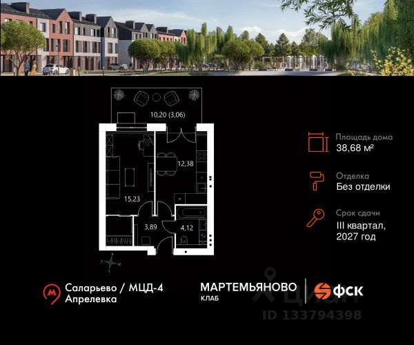 Прямая продажа от застройщика! Жилой Комплекс класса Комфорт. Продаётся 1-к квартира 71 общей площадью 35.79 кв.м на 1-м этаже 3 этажного дома. Без отделки. Расположение комплекса: "Мартемьяново Клаб" - клубный поселок таунхаусов от ФСК в Наро-Фоминском городском округе. Счастливая жизнь складывается из плюсов двух миров: городского и загородного. Вы наслаждаетесь свежим воздухом, лесными пейзажами вокруг и отдыхом у собственного пруда. При этом пользуетесь комфортной инфраструктурой, всеми центральными коммуникациями, собственной современной школой и детским садом. Закрытая охраняемая территория дарит вам чувство спокойствия и безопасности. А заказать все услуги возможно через мобильное приложение управляющей компании. Выбираться во внешний мир легко благодаря хорошей транспортной доступности. Транспортная доступность: "Мартемьяново Клаб" расположился в экологичном районе в 27 км от МКАД по Киевскому шоссе. Выбирайте любимую аудиокнигу, и уже через пару глав вы окажетесь в Москве. Добираться в город можно как на личном авто, так и на общественном транспорте до станций метро "Саларьево" и "Внуково". Авитомобиль: До Киевского шоссе - 4 минуты До МКАД - 25 минут До ТТК - 45 минут До Садового кольца - 50 минут Общественный транспорт: До станции метро "Саларьево" - 25 минут До станции МЦД4 "Апрелевка" - 10 минут До остановок общественного транспорта - 8 минут пешком Внутренняя инфраструктура: Сердце поселка - живописный пруд. У пруда расположен собственный пляж. Здесь так приятно проводить жаркие летние дни. А в зимние холода гладь пруда превращается в веселый каток. И, поверьте, дарит не меньше счастья. У пруда берет начало главная пешеходная артерия поселка - прогулочный бульвар длиною 1,8 км. Он ведет в лесную зону с ручьем и сам напоминает реку, только сухопутную. 3,3 га парковой зоны наполняют окружающее пространство энергией динамичных зон, которые сменяются зонами спокойствия. У бульвара есть "притоки" - второстепенные пешеходные улочки с площадками для игр и тихого отдыха. Круглая центральная площадь - место встречи и знакомства с соседями. Здесь круглый год проводят всевозможные культурные мероприятия, отмечают праздники, устраивают ярмарки или тематические гараж-сейлы. Рядом располагаются качели, лабиринт, детские площадки и кафе. Это позволяет каждому найти занятие по душе.