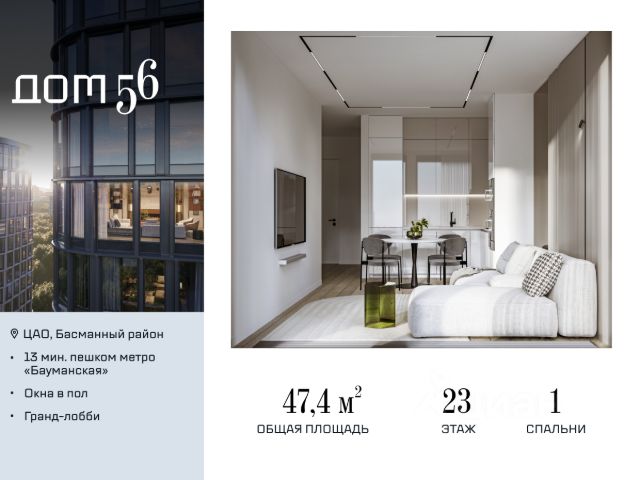 В премиум-квартале "Дом 56" на Бауманской напрямую от девелопера ГК "Галс-Девелопмент" представлена 1-комнатная квартира на 21 этаже общей площадью 45.20 м². Квартира предлагается без отделки, со свободной планировкой. Пространство позволяет воплотить дизайн - проект в соответствии с Вашими предпочтениями. "Дом 56" - расположен в Басманном районе на ул. Фридриха Энгельса, всего в 12-15 минутах пешком от станций метро "Бауманская" и "Электрозаводская". Рядом с премиум-кварталом находятся важные городские магистрали - ТТК, набережная реки Яузы и Бакунинская улица, переходящая в Спартаковскую и Маросейку. Архитектурный стиль "Дома 56" - параметрический минимализм. Футуристические фасады квартала с "эффектом закручивания" словно вращаются вокруг своей оси. Динамичный образ башен дополняет эффектное остекление - окна в пол будут в каждой квартире. "Дом 56" станет органичным продолжением современной научно-креативной среды Басманного района: - Развитое окружение - десятки различных точек притяжения; - Близость престижных вузов: МГТУ, МЭИ и Британская высшая школа дизайна; - Соседство с Технологической долиной и всем необходимым для запуска стартапа; - Набережные и парки для спорта и отдыха. "Дом 56" оснащён первоклассными инженерными системами. Входы на территорию, в здание и паркинг оборудованы системой контроля и управления доступом. С любого этажа в лобби и паркинг спускаются быстрые и бесшумные лифты премиального бренда. Во внутреннем приватном дворе будет создано пространство в бионическом стиле с лаунж-зонами, подвесными качелями, детскими плейхабами для разных возрастов, площадками для спорта и отдыха в окружении зелени. На двух подземных уровнях предусмотрен подземный паркинг и кладовые помещения. Купить 1-комнатную квартиру в новостройке рядом с метро Бауманская.