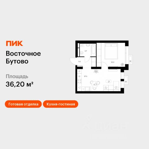 1-комнатная квартира 32,4 кв.м в ЖК "Восточное Бутово" Квартира в современном жилом комплексе комфорт-класса от застройщика "ПИК" - ЖК "Восточное Бутово" О квартире: Общая площадь - 32,4 кв.м Кухня-гостиная - 16 кв.м Комната - 9,4 кв.м Этаж -14 (15 этажная секция) Функциональная планировка: просторная кухня-гостиная, отдельная спальня для комфортного отдыха. Предчистовая отделка - штукатурка, шпаклевка, стяжка, черновая электрика и сантехника. Вам остается выполнить только финишную отделку. О жилом комплексе ЖК "Восточное Бутово" расположен в 5 км от МКАД, в окружении природных зон - рядом лесные массивы и прогулочные территории. Проект относится к классу комфорт и строится в формате комплексного освоения территории. В проекте предусмотрена собственная инфраструктура: - детские сады, школы, поликлиника - коммерческие помещения на первых этажах - благоустроенные дворы без машин, прогулочные бульвары, спортивные и детские площадки.