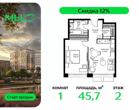 Прямая продажа от застройщика. Продаётся 1-комнатная квартира общей площадью 44.25 м² без отделки в премиальном жилом комплексе "МЫС" на 2-м этаже 12 этажного дома. Квартира расположена в корпусе "Волга". Проект МЫС — это, прежде всего, идеальное место для семей. В рамках проекта построят государственную школу, два детских сада и дворец спорта площадью 20 000 м2 с термальным комплексом, выплывным бассейном, фитнес-залом, теннисными, сквош и падел кортами и секциями для детей. На территории площадью, сравнимой с тремя парками Зарядье, появятся кафе и рестораны, пруд с набережной, спортивные и детские площадки, скейт-парк, лыжные и веломаршруты. Расположение: - 2 минуты до скоростной трассы М1 и Минского шоссе; - 10 минут до МКАД; - 15 минут до МЦД Лесной Городок - 20 минут до делового центра "Москва-Сити"; - 28 минут до аэропорта "Внуково". Благоустройство: - велосипедные и лыжные маршруты; - собственная набережная и парк; - лаунж-зоны в окружении природы; - беседки у очага; - дворец спорта площадью 20 000 м²; - термальный комплекс с тремя бассейнами; - 4 теннисных и падел-корта; - 6 сквош-кортов; - многофункциональный спортзал; - скейт-парк; - просторная площадь для прогулок с фонтаном; - детский Клуб с творческими секциями; - гастро-доминанта; - кафе у пруда, рестораны, ритейл. Окружение - соседство с лесным фондом; - школа на 1250 мест и 2 детских сада на 350 и 255 мест; - Дубковский и Подушкинский леса, парк "Рассказовка", Мещерский парк. Действуют специальные условия при 100% оплате, подробности уточняйте у менеджера в офисе продаж.