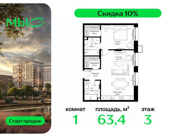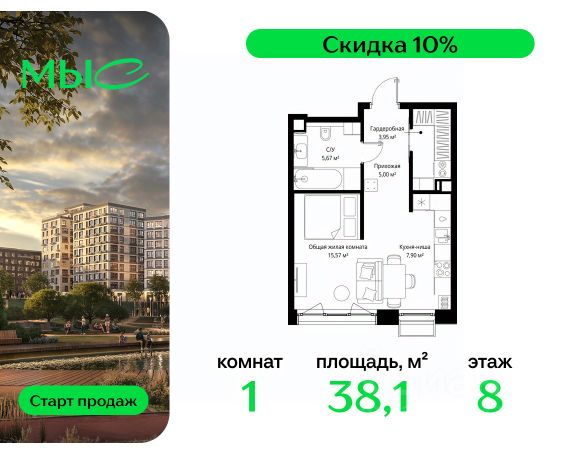 Прямая продажа от застройщика. Продаётся 1-комнатная квартира общей площадью 44.25 м² без отделки в премиальном жилом комплексе "МЫС" на 2-м этаже 12 этажного дома. Квартира расположена в корпусе "Волга". Проект МЫС — это, прежде всего, идеальное место для семей. В рамках проекта построят государственную школу, два детских сада и дворец спорта площадью 20 000 м2 с термальным комплексом, выплывным бассейном, фитнес-залом, теннисными, сквош и падел кортами и секциями для детей. На территории площадью, сравнимой с тремя парками Зарядье, появятся кафе и рестораны, пруд с набережной, спортивные и детские площадки, скейт-парк, лыжные и веломаршруты. Расположение: - 2 минуты до скоростной трассы М1 и Минского шоссе; - 10 минут до МКАД; - 15 минут до МЦД Лесной Городок - 20 минут до делового центра "Москва-Сити"; - 28 минут до аэропорта "Внуково". Благоустройство: - велосипедные и лыжные маршруты; - собственная набережная и парк; - лаунж-зоны в окружении природы; - беседки у очага; - дворец спорта площадью 20 000 м²; - термальный комплекс с тремя бассейнами; - 4 теннисных и падел-корта; - 6 сквош-кортов; - многофункциональный спортзал; - скейт-парк; - просторная площадь для прогулок с фонтаном; - детский Клуб с творческими секциями; - гастро-доминанта; - кафе у пруда, рестораны, ритейл. Окружение - соседство с лесным фондом; - школа на 1250 мест и 2 детских сада на 350 и 255 мест; - Дубковский и Подушкинский леса, парк "Рассказовка", Мещерский парк. Действуют специальные условия при 100% оплате, подробности уточняйте у менеджера в офисе продаж.