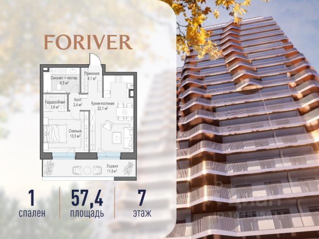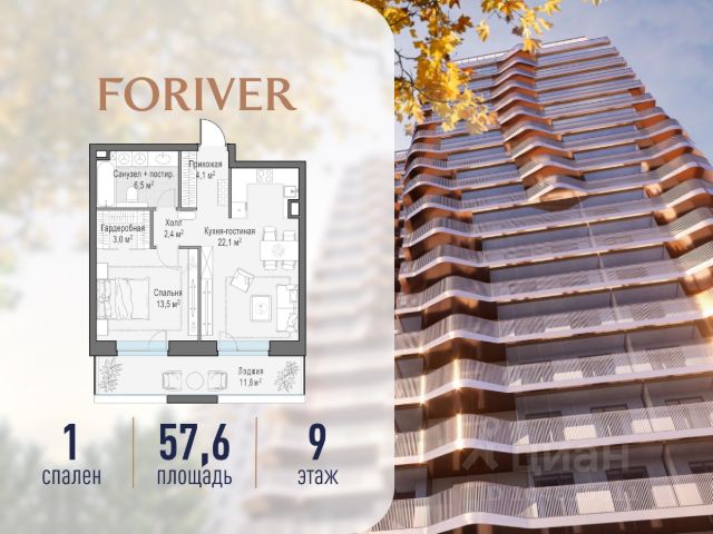 Продается 1 комнатная квартира в доме Champine (ул. Сосинская, д. 43). Общая площадь квартиры - 45.5 кв.м.