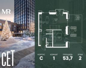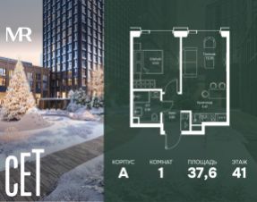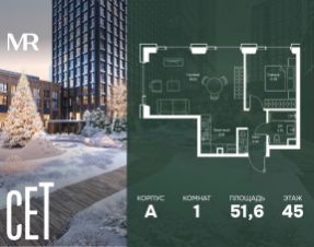 Прямая продажа от застройщика. В ЖК Сет продается 1-комнатная квартира площадью 51.60 м², расположенная в корпусе А, на 45 этаже 52 этажного дома. Сет имеет стратегически выгодное расположение в ЗАО, в районе с большой историей и блестящим будущим: между природной зоной долины реки Сетунь и Кутузовским проспектом. В рамках возведения первой очереди предусмотрено три корпуса высотой 18, 45 и 59 этажей. На верхних этажах спроектированы общедоступные смотровые площадки с панорамным обзором на центр столицы. Преимущества проекта: • Функциональные планировочные решения • Контроль проникновения через входную дверь • Система управления освещением и температурой в квартире • Система защиты от протечек с функцией перекрытия воды • Вход в подъезд по биометрическим считывателям Face ID • Скоростные лифты • Двухуровневый подземный охраняемый паркинг на 495 машино-мест Застройка Сет включает в себя не только жилые корпуса, но и инфраструктурные объекты. Все необходимое для повседневного комфорта будет расположено в шаговой доступности: • Фитнес-клуб с бассейном • Ведущая городская школа, детский сад и школа искусств • Центр культуры и досуга • Медицинский центр • Кафе и рестораны Расположение комплекса: Пешком: • Метро "Давыдково" - 17 минут • Парк "Долина реки Сетунь" - 3 минуты • Открытие новых станций метро в шаговой доступности в будущем Инфраструктура: Разнообразить свой день резиденты Веер смогут также проводя больше времени на свежем воздухе. Двор разделен на 4 зоны разных эмоций и действий, которые пересечены и соединены веерными прогулочными маршрутами: • Спортивная площадка устроена в глубине ""Кленовой рощи"" • В ""Чайном домике"" будет создан навес с утеплением для отдыха в любую погоду • Площадки для детей воплотятся в ""Волшебный лес"" с цветами, зеркалами и световым дизайном • ""Центральная площадь"" устроена у водного оазиса живописного пруда. На машине: • "Москва-Сити" - 15 минут • Садовое кольцо - 20 минут • ТЦ "Океания" - 8 минут • ТЦ "Времена года" - 13 минут • Сколково - 12 минут • Гребной канал - 17 минут Компания MR предлагает своим клиентам специальные условия приобретения квартир в рамках программ ипотечного кредитования от банков-партнеров.
