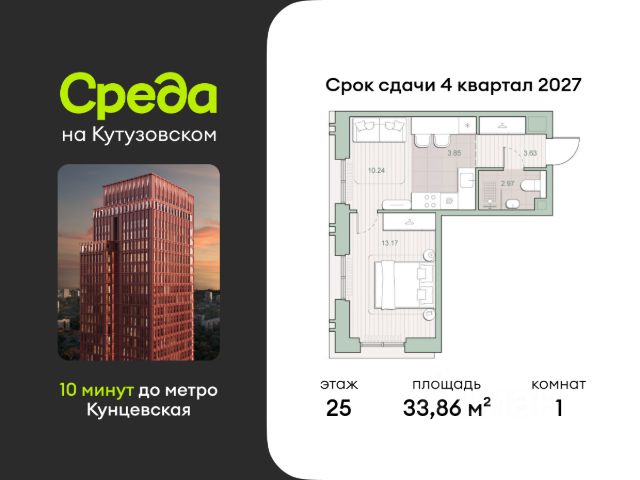 О квартире Продаётся однокомнатная квартира общей площадью 47.63 кв. м. с отделкой на выбор: черновая, White Box. Квартира на 20 этаже корпуса 5 в жилом комплексе бизнес-класса "Среда на Кутузовском". До метро "Кунцевская" 10 минут пешком. Исторический зелёный район "Среда на Кутузовском" строится в Кунцево - историческом и экологически чистом районе Москвы. Здесь нет крупных производств, много лесных массивов и роза ветров, которая обеспечивает приток чистого воздуха. Район наполнен жизнью и уже развит: много детских садов и школ, поликлиники, магазины, кафе, спортивные объекты, парки. - 10 минут пешком до станции метро "Кунцевская". - 5-8 минут на машине до Кутузовского проспекта и Можайского шоссе и 10-15 минут до Рублёвского и МКАД. - 15 минут езды до Крылатских холмов, Суворовского парка и заказника "Долина реки Сетунь". О жилом комплексе "Среда на Кутузовском" - новый квартал с башнями от 12 до 44 этажей, окружённый лесными массивами и историческими усадьбами старой Москвы. Во внутреннем дворе есть водоём, многоуровневые зоны с детскими и спортивными площадками, коворкинг на свежем воздухе и локации для уединённого отдыха. Особенности - Архитектура с многослойными фасадами. - Квартиры с террасами и мастер-спальнями. - Окна в пол на всех этажах. - Общественные лаунж-гостиные. - Собственный ландшафтный парк во дворе. - Зоны барбекю и площадки для отдыха у воды. - Умный подземный паркинг. - Стрит-ритейл на первых этажах.