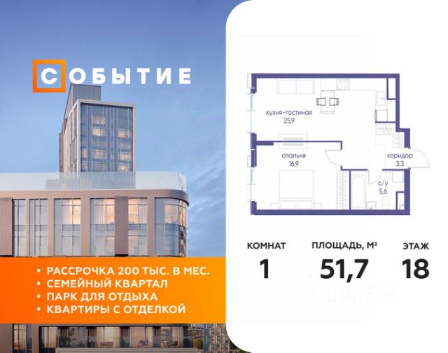 В продаже 1-к квартира от застройщика. Общая площадь 45.70, жилая 16.60, кухня 18.2. Квартира расположена на 13 этаже жилого квартала "Событие-6", корпус 1, Секция 1. Квартира без отделки. Срок сдачи: 4 кв. 2029 года. СОБЫТИЕ.6 — финальный дом парк-квартала СОБЫТИЕ на Мосфильмовской. Переезжайте в уже сформированный квартал с готовой инфраструктурой и парком! Премиальный жилой комплекс в престижном районе Москвы предлагает стильную архитектуру, продуманное благоустройство и великолепно разнообразие общественных пространств. Свой парк прямо возле дома! Архитектура Архитектура СОБЫТИЯ.6 выполнена в ультрасовременном стиле московским бюро Atrium на основе дизайн-кода британских архитекторов LDA Design и UHA London. Дом отличает оригинальная геометрия фасадов, большое остекление и высокие лобби (до 6,2 м) с авторской мебелью и светильниками. Расположение Мосфильмовская улица (Раменки) — один из престижных районов Москвы. Близость к историческому и деловому центру, природным зонам Запада столицы. Транспортная доступность: • 10 мин до Москва-Сити и ТТК; • 15 мин до Садового кольца; • 25 мин до аэропорта Внуково; • 7-10 мин до станций метро "Аминьевская" и "Мичуринский проспект". Инфраструктура: • парк "Событие" (12 га, финалист конкурса Правительства Москвы) с беговыми (1,5 км) и велодорожками (2,7 км), экотропой (1,6 км), площадками, лекторием; • школа, детский сад, магазины, салоны красоты, рестораны (к моменту заселения); • мультидвор с игровыми и спортивными площадками, мини-бульваром; • общественная терраса на 10-м этаже (коворкинг, лаунж); • Закрытые общественные пространства: детская комната, спортивный зал, коворкинг, лаунж-зоны. Паркинг 256 мест для жителей (48 — для электромобилей), 24 гостевых (5 — для электромобилей), мойки колес, кладовые, зоны для велосипедов. Окружение Парки и заповедники (Воробьёвы горы, Матвеевский лес и др.), МГУ, театр им. Н. И. Сац, стадион "Лужники". Безопасность Видеонаблюдение, контроль доступа, видеодомофоны, консьерж-сервис 24/7, системы пожарной безопасности и мультисервисная оптическая сеть.