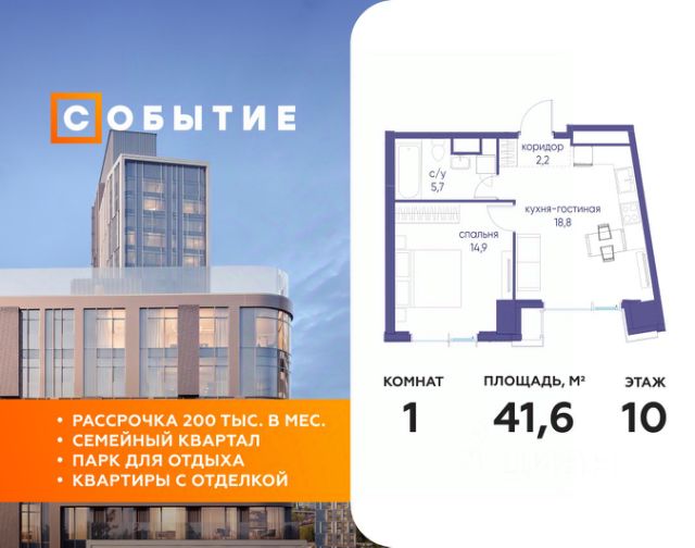 В продаже 1-к квартира от застройщика. Общая площадь 39.30, жилая 14.10, кухня 17.3. Квартира расположена на 12 этаже жилого квартала "Событие-6", корпус 1, Секция 1. Квартира без отделки. Срок сдачи: 4 кв. 2029 года. СОБЫТИЕ.6 — финальный дом парк-квартала СОБЫТИЕ на Мосфильмовской. Переезжайте в уже сформированный квартал с готовой инфраструктурой и парком! Премиальный жилой комплекс в престижном районе Москвы предлагает стильную архитектуру, продуманное благоустройство и великолепно разнообразие общественных пространств. Свой парк прямо возле дома! Архитектура Архитектура СОБЫТИЯ.6 выполнена в ультрасовременном стиле московским бюро Atrium на основе дизайн-кода британских архитекторов LDA Design и UHA London. Дом отличает оригинальная геометрия фасадов, большое остекление и высокие лобби (до 6,2 м) с авторской мебелью и светильниками. Расположение Мосфильмовская улица (Раменки) — один из престижных районов Москвы. Близость к историческому и деловому центру, природным зонам Запада столицы. Транспортная доступность: • 10 мин до Москва-Сити и ТТК; • 15 мин до Садового кольца; • 25 мин до аэропорта Внуково; • 7-10 мин до станций метро "Аминьевская" и "Мичуринский проспект". Инфраструктура: • парк "Событие" (12 га, финалист конкурса Правительства Москвы) с беговыми (1,5 км) и велодорожками (2,7 км), экотропой (1,6 км), площадками, лекторием; • школа, детский сад, магазины, салоны красоты, рестораны (к моменту заселения); • мультидвор с игровыми и спортивными площадками, мини-бульваром; • общественная терраса на 10-м этаже (коворкинг, лаунж); • Закрытые общественные пространства: детская комната, спортивный зал, коворкинг, лаунж-зоны. Паркинг 256 мест для жителей (48 — для электромобилей), 24 гостевых (5 — для электромобилей), мойки колес, кладовые, зоны для велосипедов. Окружение Парки и заповедники (Воробьёвы горы, Матвеевский лес и др.), МГУ, театр им. Н. И. Сац, стадион "Лужники". Безопасность Видеонаблюдение, контроль доступа, видеодомофоны, консьерж-сервис 24/7, системы пожарной безопасности и мультисервисная оптическая сеть.