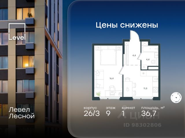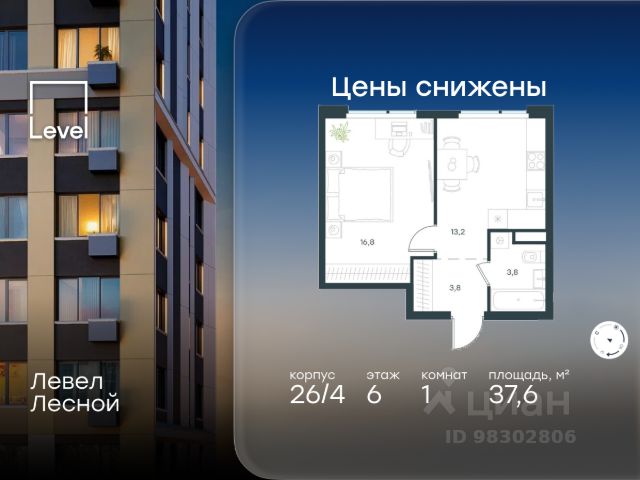 Цена указана с учётом скидки при 100%-й оплате, несубсидированной ипотеке, рассрочке (кроме программы "Рассрочка 0%"). В районе, утопающем в густой зелени лесов, многочисленных парков и скверов, продаётся 1-комнатная квартира площадью 37.60 кв.м с предчистовой отделкой. Квартира расположена на 6 этаже в жилом комплексе комфорт-класса Левел Лесной (компания Level Group/Левел групп). Отличная транспортная доступность: - 25 мин. пешком до станции метро "Пятницкое шоссе"; - 28 мин. на автобусе до станции метро и МЦД-2 "Волоколамская"; - 11 мин. на авто до МКАД; - 25 мин. на авто до ТТК. Продуманный архитектурный проект: - Концепция проекта Левел Лесной от бюро СПИЧ; - Высотность комплекса до 15 этажей с уникальными видами на лесные массивы и город; - Высота потолков до 3 м; - Современные окна высотой до 1,6 м, в части квартир предусмотрены окна в пол. Высота подоконников 0,6 м; Расположение: Жилой комплекс Левел Лесной строится в зелёной зоне ближайшего Подмосковья, г.о. Красногорск в посёлке Отрадное. Шаговая и автомобильная доступность до метро и больших транспортных артерий города. За 25 минут вы дойдёте до станции метро "Пятницкое шоссе", а за 20 минут на машине сможете доехать до станции метро "Тушинская". Район окружен роскошной зеленью лесов и парковых зон, занимающих территорию свыше 1 000 гектаров. Помимо благоприятной экологии, здесь множество возможностей для активного отдыха и поддержания физической формы. Облагороженная территории с полностью развитой инфраструктурой. На территории проекта находится детский сад и школа "Светлые Горы", которая входит в список лучших частных школ от Forbes Education (по данным на 2023г.). Кроме того, в пешей доступности расположено ещё 8 детских садов, а также запланировано открытие современной муниципальной школы. В непосредственной близости находятся сетевые супермаркеты и локальные магазины, аптеки, клиники, почта, библиотека, салоны красоты, рестораны, спортивные и творческие секции, развивающие детские центры. В 12 минутах пешком расположен торговый парк "Отрада" с продуктовым и строительным гипермаркетами, магазинами, кинотеатром и развлечениями для детей. Внутренняя инфраструктура: Мы знаем, как важно, чтобы магазины и сервисы были всегда рядом. В сданных корпусах жилого комплекса Левел Лесной уже расположена полностью готовая развитая инфраструктура. На первых этажах корпуса 27 предусмотрено ещё 14 коммерческих помещений. Благоустройство: Продуманное пространство и аура приватного европейского городка рождают чувство лёгкости и расслабления у каждого, кто попадает на территорию проекта. Концепцию общественных площадок разработали в партнёрстве два архитектурных бюро: "Хайлайт Архитектура" (Highlight Architecture) и "Скейп" (Scape). В безопасных дворах без машин каждый обязательно найдёт себе место для вдохновения, отдыха и спорта. Купить 1-комнатную квартиру в новостройке рядом с метро Митино.