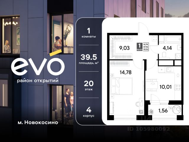 Продается однокомнатная квартира 39.52 кв.м. в жилом комплексе EVO на 25 этаже по адресу: Московская область, г. Реутов, ул. Комсомольская. Скидка 10% на пул квартир!* EVO - проект комфорт-класса от девелопера Dogma. Каждый житель сможет открыть для себя максимум возможностей. Совершенствоваться во всех направлениях: физическом, эмоциональном и материальном. В EVO можно открыть для себя новые виды спорта, найти единомышленников по хобби, партнеров по бизнесу, развивать в детях новые грани, наслаждаться природой и лаконичной архитектурой. Более 6 га благоустройства в первой очереди! - Зеленый двор без машин, кленовая аллея для прогулок. - Нейродинамические площадки для детей разных возрастов. - Workout зона, столы для пинг-понга, места для занятия йогой. велодорожки и дорожки для скандинавской ходьбы. - Детский сад на 180 мест и школа на 750 мест. - Кроссбукинг. - Лобби с зоной ожидания, колясочной и лапомойкой. - Магазины и кафе на первых этажах. БЕЗОПАСНОСТЬ - Закрытая территория. - Круглосуточное видеонаблюдение. - Контроль доступа. РАСПОЛОЖЕНИЕ Пешком - 7 минут до станции Реутов. - 20 минут до метро Новокосино. На машине - 4 минуты до МКАД. - 6 минут до шоссе Энтузиастов. - 9 минут до Носовихинское шоссе. - 13 минут до МСД (Московский скоростной диаметр). СОЦИАЛЬНАЯ ИНФРАСТРУКТУРА В первой очереди предусмотрено строительство детского сада на 180 мест и школы на 750 учащихся. В 10 минутах ходьбы от EVO находится детский технопарк "Изобретариум", в котором более 60 научных секции: от IT до промышленного дизайна. Для творческих ребят рядом есть художественная и музыкальные школы, хоровая студия. ОКРУЖЕНИЕ - Реутовский центральный парк, Александровский сквер, Фабричный пруд. - ТЦ "Экватор", ТК "Шоколад". - Спортивный комплекс "Старт", Ледовый комплекс "Реутов Арена". - Музей-усадьба "Кусково". *Скидка 10% на выделенный пул квартир действительна при покупке в ипотеку. Продам 1-комнатную квартиру в новостройке рядом с метро Новокосино.