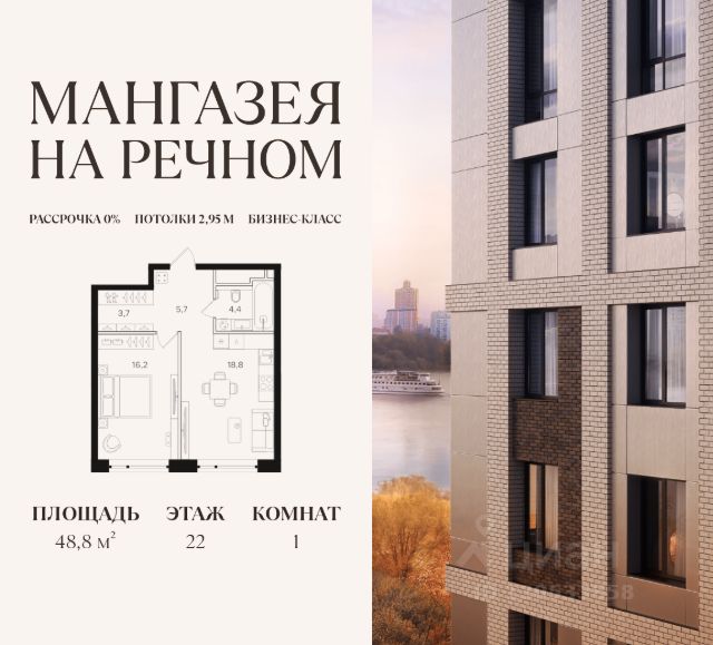 В продаже 1-к квартира площадью 45.9 м2. Функциональная планировка, кухня-гостиная, просторные санузел и гардеробная. Квартира расположена на 7-м этаже 12-этажного дома. Стоимость указана с учетом скидки 12%, экономия составит 3 190 234 рублей! Стоимость квартиры без скидки 26 585 280 рублей. Условия покупки со скидкой 10%: - 100% оплата - Базовая ипотека Условия покупки без скидки: - Семейная ипотека от 3,5% на весь срок - Ипотека 0,11% на первый год - Рассрочка без процентов - Trade-in с проживанием на время строительства дома "Мангазея на Речном" расположена рядом с набережной, парками и территорией Северного речного вокзала. Первая очередь проекта два дома 12 и 24 этажа с приватным двором, ландшафтным благоустройством и инфраструктурой только для резидентов: кинозал, коворкинг, переговорные, зоны отдыха и комнаты для занятия фитнесом. Инфраструктура: - Школа на 1000 мест и детский сад - Дом Wellness со СПА-центром, фитнесом и массажными кабинетами и два бассейна, один из них под открытым небом - Два бассейна, один из них под открытым небом - Прогулочная набережная протяженностью 3,2 км с террасами - Зона воркаута и детские площадки - Ретейл, кафе, рестораны и бутики на первых этажах - Причалы для остановки яхт и небольших катеров Транспортная доступность: - 10 минут пешком до м. Речной вокзал - 15 минут пешком до м. Беломорская - 15 минут на машине до Белорусского вокзала - 17 минут на машине до Садового Кольца В первых корпусах "Мангазеи на Речном" представлены квартиры бизнес-класса с мастер-спальнями, террасами и видами на парк. Эксклюзивные форматы лоты с увеличенной высотой потолков и собственными выходом на благоустроенную территорию. Купить 1-комнатную квартиру в новостройке рядом с метро Речной вокзал.
