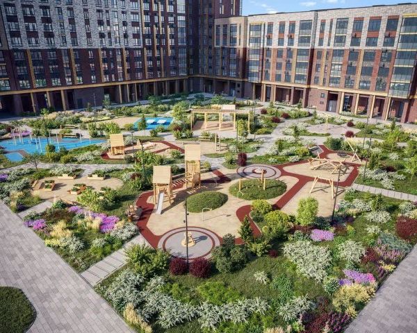 Закрытый, приватный двор без машин с ландшафтным дизайном, детской площадкой и зонами отдыха.