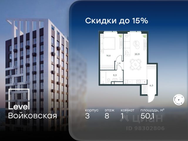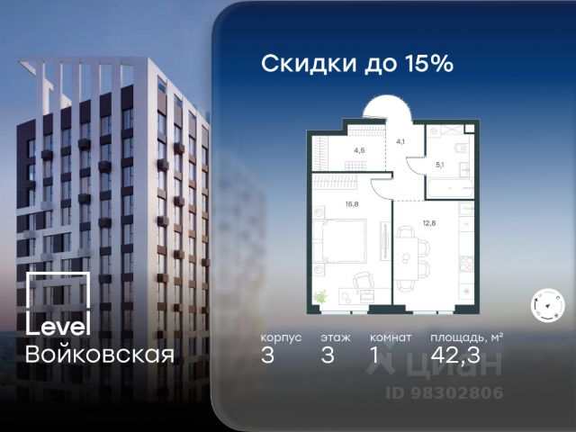 Цена указана с учётом скидки при 100%-й оплате, несубсидированной ипотеке, рассрочке (кроме программы "Рассрочка 0%"). Продается 1-комнатная квартира площадью 42.10 кв. м без отделки. Квартира находится на 3 этаже 20-этажного корпуса 5, в новом жилом комплексе бизнес-класса Level Войковская, расположенном рядом с живописным заповедником "Покровское-Стрешнево" (застройщик - компания Level Group/Левел групп). Прекрасная транспортная доступность - 7 мин. пешком до станции МЦК "Балтийская"; - 15 мин. пешком до станции метро "Войковская"; - 8 мин. на машине до ТТК; - 15 мин. на машине до центра Москвы; - 20 мин. на машине до Москва-Сити. Продуманный архитектурный проект - стильная архитектура от мастерской Фефелова В. В.; - панорамные виды на парки, Химкинское водохранилище и Останкинскую башню; - лобби с высотой потолков до 6,45 метров; - более 20 видов планировочных решений, включая редкие форматы квартир с террасой и увеличенной высотой потолков до 5,42 метров; - 2 варианта дизайнерской отделки в корпусе 4, предлагаются как дополнительная опция к отделке white box: стиль Modern в светлых холодных тонах и стиль Classic в нейтральной бежевой гамме. Квартиры в корпусах 3 и 5 сдаются без отделки. Расположение Level Войковская строится в престижном Северном округе Москвы. Развитая инфраструктура и живописная природа переплетаются в единый ансамбль, столь значимый для комфортной жизни. Войковский район окружают парки и набережные. В шаговой доступности - парк "Покровское-Стрешнево", не более 15-ти минут на велосипеде занимает путь до Тимирязевского парка и 9-ти минут до парка усадьбы Михалково. Рядом более 60 школ, 75 дошкольных учреждений, 17 государственных и 6 частных вузов, 25 супермаркетов, 4 торговых центра, среди которых ТЦ "Метрополис" и ТЦ "Авиапарк". Внутренняя инфраструктура На территории жилого комплекса предусмотрены коммерческие помещения: кафе, ресторан, пекарня и другие сервисы откроются на первых этажах корпусов. Для жителей будет доступен отапливаемый подземный паркинг на 244 машино-места с доступом с любого этажа на лифте. На территории паркинга будет расположено 125 кладовых помещений для хранения сезонного инвентаря. Лобби и благоустройство Дизайн лобби Level Войковская создан совместно с бюро BLANK. Это уютные гостиные, где хочется задержаться. Теплая цветовая гамма, ресепшен, зоны ожидания, лапомойки и гостевые санузлы - каждая деталь превращает лобби в комфортное продолжение вашего дома. 1,15 га площади в первых двух этапах строительства отведено под приватный внутренний двор, который спроектирован совместно с бюро "Правда". Детские площадки для всех возрастов, спортивные пространства для йоги, воркаута и петанка, уютные зоны для тихого отдыха или работы. Здесь утро начинается с вдохновения, а вечер наполнен приятными моментами. Лифты Комфортное перемещение внутри жилого комплекса будут обеспечивать надёжные лифты с доступом в паркинг с жилых этажей. В каждом корпусе предусмотрено по 3 грузопассажирских лифта. Купить 1-комнатную квартиру в новостройке рядом с метро Войковская.