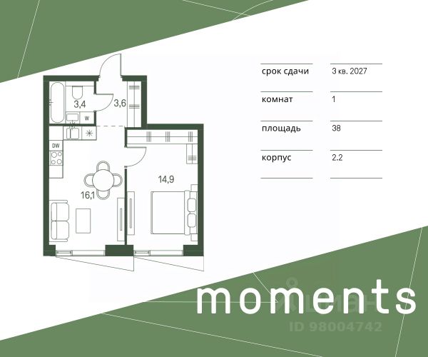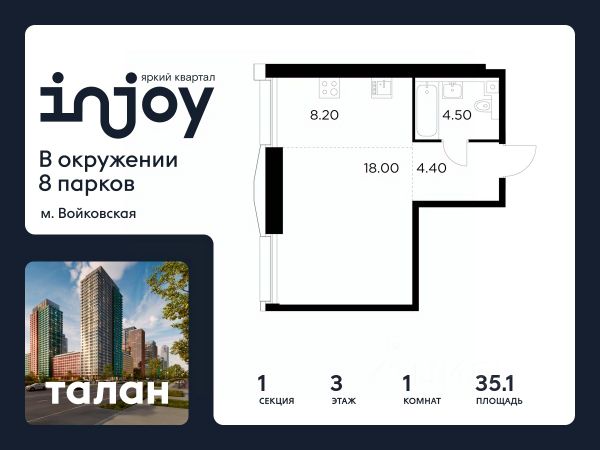 Прямая продажа от застройщика. В жилом квартале, расположенном в Войковском районе Москвы, продаётся 1-комнатная квартира площадью 40.7 кв.м без отделки. Квартира расположена на 16 этаже 35-этажного дома, корпус 1, в жилом квартале бизнес-класса INJOY. INJOY отделен от Ленинградского шоссе исторической застройкой и расположен всего в одном километре от магистрали: это возможность быстро добраться до центра или в любой район города по МКАДу или ТТК. Для автомобилей в INJOY — удобный подземный паркинг с доступом на лифте. Здесь же расположены кладовые площадью от 2,1 до 9 кв. м. Усилители сотового сигнала в лифтах и паркинге позволяют вести важные разговоры, не прерываясь на полуслове. Десятки мест отдыха вокруг INJOY дарят детям и взрослым запоминающиеся развлечения в любую погоду: от прогулок по паркам и природным зонам до интересного досуга в кругу семьи или друзей. 10 минут до парка Покровское-Стрешнево 12 минут до усадьбы Михалково 15 минут до Химкинского водохранилища 7 минут до ТРЦ "Метрополис" INJOY расположен в развитом сформировавшемся районе, что обеспечивает жителям обширную инфраструктуру в пешей доступности. МЦК "Балтийская" - 200 м Ленинградское шоссе - 1 км м. Войковская - 1 км ТТК - 7 км В проекте INJOY три очереди, разновидность которых формирует силуэт живого мегаполиса. Архитекторы международного бюро AI Studio придали индивидуальность каждому корпусу, чтобы все уголки INJOY обрели особенный характер. Планировки и форматы квартир уникальны: пентхаусы, квартиры с террасами, мастер-спальнями, выходом на променад, угловым остеклением, лоджиями, гардеробными, кладовыми и постирочными. Внутренний двор INJOY продолжает общую концепцию благоустройства и включает в себя: три детские площадки для разных возрастов, зону work-out, природную озеленённую зону, променад с зонами для релакса, йоги и амфитеатром с арт-объектами. Закрытый двор, видеонаблюдение и контроль доступа обеспечивают безопасность каждому жителю комплекса. Стоимость квартиры - 19743000 Р. Срок сдачи - 1 квартал 2027. Более подробную информацию по объекту уточняйте по телефону и в отделе продаж. Купить 1-комнатную квартиру в новостройке рядом с метро Войковская.