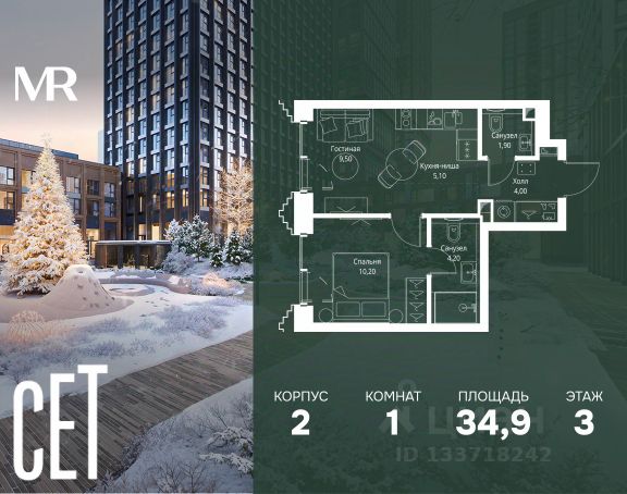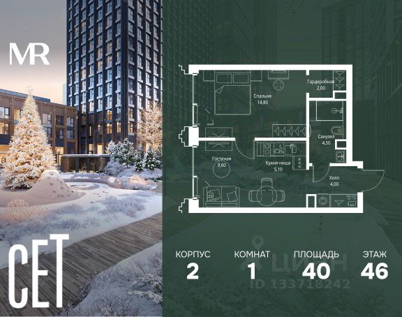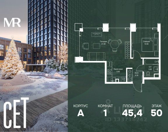 Прямая продажа от застройщика. В ЖК Сет продается 1-комнатная квартира площадью 51.60 м², расположенная в корпусе А, на 45 этаже 52 этажного дома. Сет имеет стратегически выгодное расположение в ЗАО, в районе с большой историей и блестящим будущим: между природной зоной долины реки Сетунь и Кутузовским проспектом. В рамках возведения первой очереди предусмотрено три корпуса высотой 18, 45 и 59 этажей. На верхних этажах спроектированы общедоступные смотровые площадки с панорамным обзором на центр столицы. Преимущества проекта: • Функциональные планировочные решения • Контроль проникновения через входную дверь • Система управления освещением и температурой в квартире • Система защиты от протечек с функцией перекрытия воды • Вход в подъезд по биометрическим считывателям Face ID • Скоростные лифты • Двухуровневый подземный охраняемый паркинг на 495 машино-мест Застройка Сет включает в себя не только жилые корпуса, но и инфраструктурные объекты. Все необходимое для повседневного комфорта будет расположено в шаговой доступности: • Фитнес-клуб с бассейном • Ведущая городская школа, детский сад и школа искусств • Центр культуры и досуга • Медицинский центр • Кафе и рестораны Расположение комплекса: Пешком: • Метро "Давыдково" - 17 минут • Парк "Долина реки Сетунь" - 3 минуты • Открытие новых станций метро в шаговой доступности в будущем Инфраструктура: Разнообразить свой день резиденты Веер смогут также проводя больше времени на свежем воздухе. Двор разделен на 4 зоны разных эмоций и действий, которые пересечены и соединены веерными прогулочными маршрутами: • Спортивная площадка устроена в глубине ""Кленовой рощи"" • В ""Чайном домике"" будет создан навес с утеплением для отдыха в любую погоду • Площадки для детей воплотятся в ""Волшебный лес"" с цветами, зеркалами и световым дизайном • ""Центральная площадь"" устроена у водного оазиса живописного пруда. На машине: • "Москва-Сити" - 15 минут • Садовое кольцо - 20 минут • ТЦ "Океания" - 8 минут • ТЦ "Времена года" - 13 минут • Сколково - 12 минут • Гребной канал - 17 минут Компания MR предлагает своим клиентам специальные условия приобретения квартир в рамках программ ипотечного кредитования от банков-партнеров. Купить 1-комнатную квартиру в новостройке в районе Можайский в Москве.