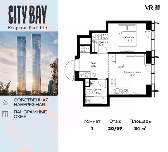 Прямая продажа от застройщика. Продаётся 1-к квартира общей площадью 34 м² без отделки в ЖК City Вау, квартале Pacific, на 20-м этаже 59 этажного дома. Концепция жилого комплекса City Вау - настоящий город в городе с отлично развитой инфраструктурой и собственной благоустроенной набережной. На территории жилого комплекса расположено пять кварталов - Atlantic, Pacific, Indian, North, Cliff. Жилой квартал City Вау отличается оригинальной концепцией и выделяется среди других проектов такими характеристиками как: - Архитектура, - Виды из окон, - Природное окружение, вызывая гордость у жителей и восхищение у прохожих. Вся жизнь района Покровское-Стрешнево строится вокруг водных объектов: - Пойма реки Сходни с уникальной экосистемой, - Речка Химка и Химкинское водохранилище, - Москва-река, - Канал имени Москвы. Кругом вода, и местные с удовольствием этим пользуются. А сразу за рекой - центр водного спорта в Строгино с вейк-парком и яхт-клубами. Помимо воды, здесь очень много зелени: - Рядом Сходненский ковш памятник природы, естественный амфитеатр глубиной 40 метров; - Парк при усадьбе Братцево с фруктовым садом; - Дубовая роща "Маяк", - Алешкинский лес; - Лесопарк Покровское-Стрешнево с пляжами и бобрами. Главные транспортные артерии района: - Волоколамское шоссе, - Таганско-Краснопресненская линия метро и МЦД-2. Всего за 20 минут можно добраться до центра на машине или метро, а МЦД связывает ЖК City Вау с северными, восточными и юго-восточными районами. Компания MR Group предлагает своим клиентам специальные условия приобретения квартир в рамках программ ипотечного кредитования от банков-партнеров.