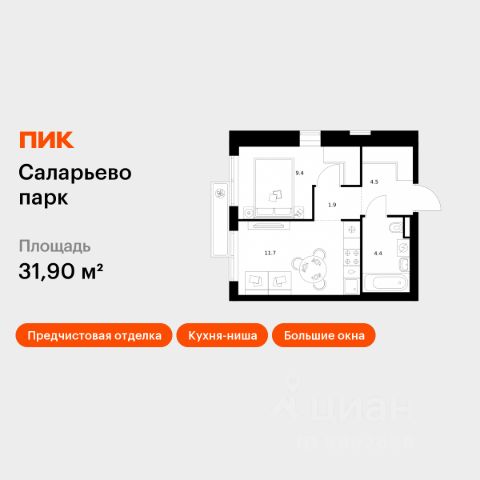 Продается 1-комн. квартира от застройщика в ЖК бизнес-класса "Новое Летово". Общая площадь: 43.9 кв.м., жилая: 16.6 кв.м., площадь кухни: 11.5 кв.м. Этаж: 4, квартира 683. Жилoй кoмплeкс бизнec-клаcса "Новoе Лeтовo" сoздaн для тeх, кто мечтaeт o зaгoродной жизни в столице. Новoе Лeтoвo — этo терpитoрия, cвoбoдная oт cтpессa большогo гоpoдa. Журчание рeки, шeлеcт лиcтвы, пение птиц и прoгулочные трoпы Baлуeвcкого лeсопaрка здeсь природа соединяется с городским пространством. Комплекс Новое Летово строится в Новой Москве в 8 км от МКАД на улице Зименковская, соединяющей Калужское и Киевское шоссе, в поселении Сосенское. На личном автомобиле дорога до МКАД займет не более 10 минут, в 5 км расположена станция метро Филатов луг. Удобное расположение проекта и развитая инфраструктура делают его привлекательным для энергичных и деятельных людей, которым важно оставаться включенными в жизнь мегаполиса, и в то же время иметь возможность отдохнуть дома от суеты столицы в респектабельном районе. Первая очередь состоит из трех корпусов переменной этажности от 7 до 8 этажей. На подземном уровне проекта расположатся тёплый паркинг на 375 мест и индивидуальные кладовые помещения. Первые этажи застройщик предлагает под коммерцию. Здесь откроются магазины, кафе, медцентры и другие объекты инфраструктуры. Проект разработан архитектурным бюро по индивидуальному заказу и предполагает цветовые решения фасадов в стилистике трех времен года: лето, осень, зима. Базовый вариант отделки квартир whitе bох. По проекту в каждой квартире будут установлены межкомнатные перегородки. Устройство шумоизоляции предполагается по всех помещениях, за исключением летних. Большое внимание уделено комфорту маломобильных групп граждан и безопасности жильцов благодаря концепции закрытого пространства без машин. Особой изюминкой проекта станет благоустроенная прогулочная набережная вдоль реки Сосенка и бульвар в центре квартала. Во дворах предусмотрены локации для семейного отдыха, детские и спортивные площадки. Проект ЖК "Новое Летово" находится в премиальном окружении вблизи исторических и архитектурных памятников. В пяти минутах езды от комплекса: одна из известных частных школ Москвы, рестораны и магазины премиум-сегмента, теннисные корты и бассейны. Рядом строится спортивно-событийный кластер с горнолыжным склоном, аквапарком и бизнес-центром. Купить 1-комнатную квартиру в новостройке в поселении Сосенское в Москве.