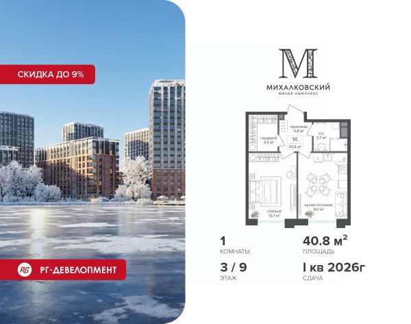 Скидка 9% при покупке квартиры! Цена указана с учетом максимального размера скидки. Продаётся 1-к квартира 36,4 кв.м. в ЖК "Михалковский" на 7-м этаже 15 этажного дома. Ипотека для каждого! Полная стоимость кредита от 13,192% до 17,149%. Ставка от 0,11% в АО "Альфа-Банк", ген. лицензия ЦБ РФ 1326 от 16.01.2015. Ставка фиксируется на первые 12 месяцев, далее полная стоимость кредита от 22,022% до 24,599% ставка 21,59%. Первоначальный взнос — от 20,1% от стоимости квартиры. Срок кредитования — от 4 до 30 лет. Компания "РГ-Девелопмент" предоставляет скидку на квартиры в жилом комплексе. Акция действительна до 15.03.2026 включительно. Чтобы воспользоваться предложением, необходимо подписать договор на приобретение недвижимости до 15.03.2026 включительно. При приобретении квартиры доступна беспроцентная рассрочка с первым платежом от 30%. У покупателя также есть право воспользоваться скидкой в размере 7% от полной стоимости квартиры. Условия программы рассрочки: - Скидка 7% - Первый платеж — от 30% от стоимости объекта. - Оставшаяся сумма выплачивается не позднее 31.05.2026. - Действует на приобретение квартир в корп. 4, 5 Действует программа "Растет семья - растет и квартира". Компания "РГ-Девелопмент" вошла в ТОП-10 девелоперов по объёму введённого жилья в "Старой Москве" по итогам 2025 года. Прямая продажа от застройщика! Квартиры без отделки. Срок сдачи 1 кв. 2026 г. Особенности проекта: Завораживающие виды Красивое благоустройство Уникальная локация для Москвы (рядом Головинский парк, пруды, усадьба Михалково) Рядом с центром В проекте присутствует: архитектура голландского бюро MLA+, зеленые зоны, транспортная доступность, благоустроенная территория, подземный паркинг, детский сад и выход на Головинский парк с пятью прудами. Название комплекса указывает на одну из его черт - соседство с имением Михалково. Позвольте себе жить в месте, где проводили свой досуг династии Дашковых и Паниных. Продам 1-комнатную квартиру в новостройке станция Коптево (МЦК).