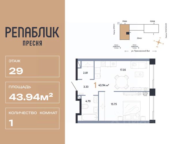 Рассрочка 0% с первым взносом от 20%, ипотека с субсидией или наличные. Подберём способ оплаты индивидуально. Продается 2комнатная квартира на 2 этаже от застройщика Страна Девелопмент. Площадь квартиры 45.24 кв. м. Дизайн-квартал "Republic" — новый проект премиум-класса в Москве от федерального застройщика "Страна Девелопмент". ЦАО, Пресня, 7 мин. от метро "Белорусская". 10 жилых башен и 4 восстановленных здания локомотивного депо образуют уникальное пространство. "Republic" — место, где вы ощутите гармонию истории и современности. За 12 мин. вы сможете дойти до Московского зоопарка, за 10 мин. на авто доехать до Патриарших прудов и Белого дома. Преимущества • Благоустройство. SPA-комплекс с бассейном и термами, гастрономический, учебный и шопинг-центры, приватный бульвар и яркие арт-пространства — для жителей предусмотрены все элементы премиального комфорта. • Панорама на центр. Наслаждайтесь видами ЦАО каждый день: панорама на историческую Пресню и башни Москва-Сити — из своей квартиры или с приватной террасы на крыше. • Концептуальное лобби в каждой башне. С общей террасой на кровле, с библиотекой, коворкингом и фитнес-рум. Стойка консьержа перетекающая в бар и др. • Современные форматы квартир. Свободные планировки, с террасой или балконом, с возможностью установки камина, от 1-комнатных до пентхаусов. • Отделка Квартиры сдаются без отделки или в формате White box. При White box уже выполнены все шумные и грязные работы: произведена разводка электричества с подрозетниками, установлены откосы из гипсокартона, устроена стяжка пола с шумоизоляцией и др. Способы покупки Сотрудники "Страна Девелопмент" будут сопровождать вас на каждом этапе сделки, помогут получить одобрение по ипотеке или снизить ежемесячный платеж. - ипотека (стандартная/с субсидией/траншевая) - рассрочка (с ПВ от 20%) - с использованием материнского капитала - оплата наличными Продам 1-комнатную квартиру в новостройке на улице Пресненский Вал в Москве.