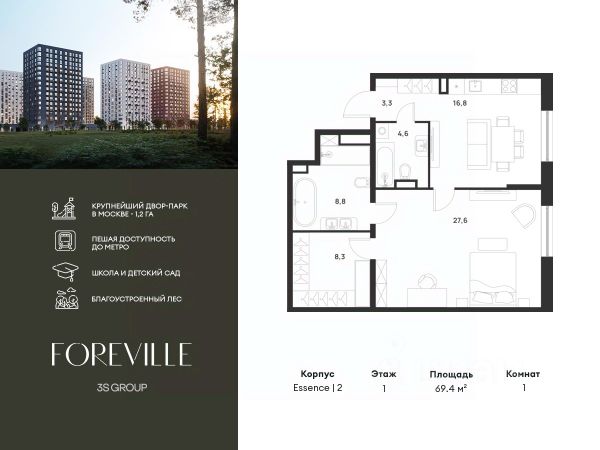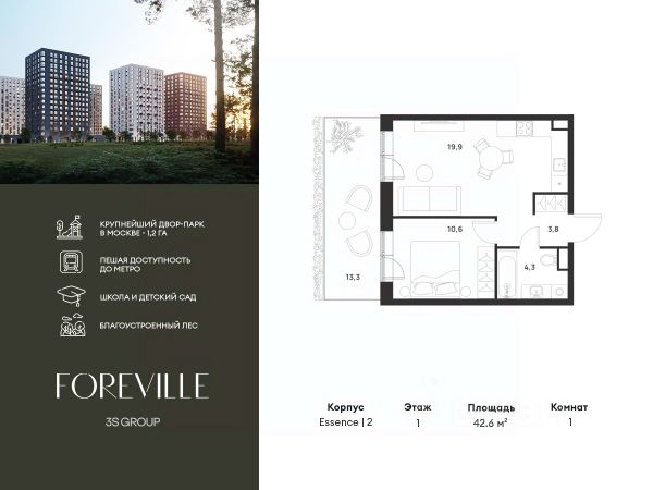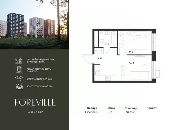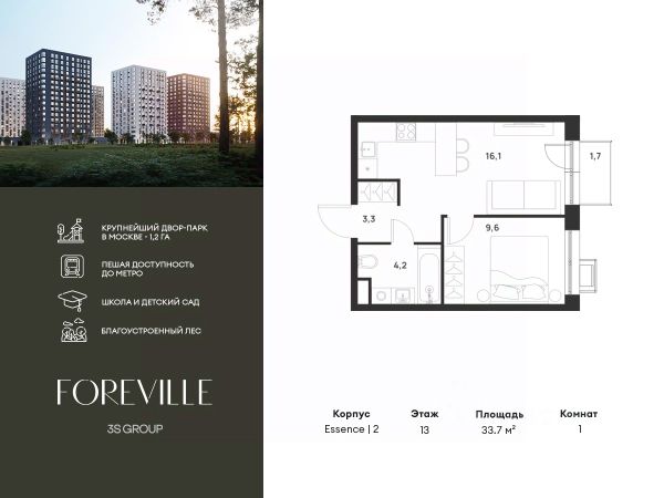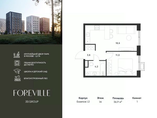 Предчистовая отделка в подарок! Пешая доступность от метро и московская прописка! Продается уютная 1-комн. квартира площадью 38,8 кв.м на 9 этаже 17 этажного жилого комплекса бизнес-класса Foreville от 3S Group. Общая площадь: 38,8 кв.м., жилая: 10,7 кв.м., площадь кухни-гостиной: 20,1 кв.м., высота потолков: 2,72 м., окна выходят во двор. Квартира предлагается без отделки, что идеально подходит для воплощения собственного дизайнерского решения. Также доступна опция предчистовой отделки, стоимость которой включается в общую цену квартиры. О проекте: Пространство Комплекс располагает крупнейшим приватным двор-парком в Новой Москве площадью 1,2 Га, предлагая жителям огромное пространство для отдыха, спорта и игр на свежем воздухе. Природный ландшафт Внутренний лесопарк с более чем 183 взрослыми деревьями и 10 320 цветущими кустарниками создает уникальную природную атмосферу для каждого времени года. Игровые и спортивные зоны Обширные площадки с безопасным покрытием, специализированные зоны для детей разных возрастных групп и взрослых, включая воркаут и настольный теннис, способствуют активному и здоровому образу жизни. Экологичность и долговечность Использование натуральных материалов, таких как лиственница, и крупноформатной бетонной плитки для покрытия, подчеркивает стремление проекта к экологичности и устойчивости. Безопасность и уединение Внутренний двор без машин обеспечивает безопасность для детей и спокойствие для взрослых. Территория огорожена и находится под круглосуточным видеонаблюдением. Сохранение времени Благодаря превосходной транспортной доступности и близости к новой станции метро Корниловская, Foreville позволяет жителям экономить время для семьи и отдыха на природе, минимизируя необходимость длительных поездок. Foreville не просто жилье, а целая экосистема для комфортной и гармоничной жизни на свежем воздухе, совмещая преимущества городской инфраструктуры и непосредственную близость к природе.