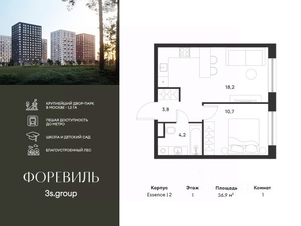 Предчистовая отделка в подарок! Пешая доступность от метро и московская прописка! Продается уютная 1-комн. квартира площадью 38,6 кв.м на 13 этаже 17 этажного жилого комплекса бизнес-класса Foreville от 3S Group. Общая площадь: 38,6 кв.м., жилая: 9,9 кв.м., площадь кухни-гостиной: 19,9 кв.м., высота потолков: 2,72 м., окна выходят во двор. Квартира предлагается без отделки, что идеально подходит для воплощения собственного дизайнерского решения. Также доступна опция предчистовой отделки, стоимость которой включается в общую цену квартиры. О проекте: Пространство Комплекс располагает крупнейшим приватным двор-парком в Новой Москве площадью 1,2 Га, предлагая жителям огромное пространство для отдыха, спорта и игр на свежем воздухе. Природный ландшафт Внутренний лесопарк с более чем 183 взрослыми деревьями и 10 320 цветущими кустарниками создает уникальную природную атмосферу для каждого времени года. Игровые и спортивные зоны Обширные площадки с безопасным покрытием, специализированные зоны для детей разных возрастных групп и взрослых, включая воркаут и настольный теннис, способствуют активному и здоровому образу жизни. Экологичность и долговечность Использование натуральных материалов, таких как лиственница, и крупноформатной бетонной плитки для покрытия, подчеркивает стремление проекта к экологичности и устойчивости. Безопасность и уединение Внутренний двор без машин обеспечивает безопасность для детей и спокойствие для взрослых. Территория огорожена и находится под круглосуточным видеонаблюдением. Сохранение времени Благодаря превосходной транспортной доступности и близости к новой станции метро Корниловская, Foreville позволяет жителям экономить время для семьи и отдыха на природе, минимизируя необходимость длительных поездок. Foreville не просто жилье, а целая экосистема для комфортной и гармоничной жизни на свежем воздухе, совмещая преимущества городской инфраструктуры и непосредственную близость к природе.
