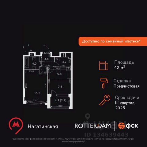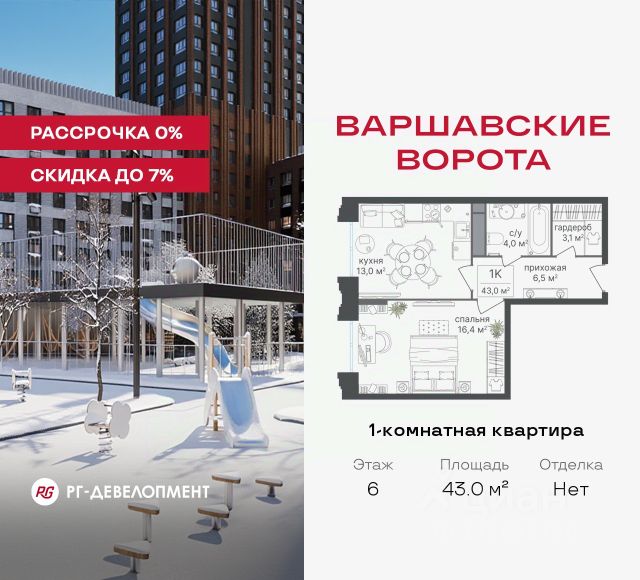 Рассрочка 0% + скидка 5%. Первый платёж 50% при ДДУ, второй 50% — через 12 мес. до ввода ЖК. Продаются 1-комнатные апартаменты 41.3 кв.м. в МФК "Варшавские ворота" на 8-м этаже 9 этажного дома. МФК "Варшавские ворота" — это проект, в котором учтен широкий спектр требований: от транспортной доступности и развитой инфраструктуры до архитектурной выразительности и экологического окружения. Апартаменты в МФК "Варшавские ворота" подойдут для тех, кто ищет продуманное жилье в Москве или готовый инвестиционный актив. Апартаменты здесь — это: - возможность жить комфортно в удобном городском формате — с природой, метро, сервисом и паркингом; - возможность купить лот с готовой отделкой, чтобы вложить минимальные инвестиции в ремонт и получить максимум возможностей от сдачи; - экономия на налоге на имущество, кадастровая стоимость апартаментов ниже ~ на 30% кадастровой стоимости квартиры; - высокая инвестиционная доходность объекта за счет более низкой цены покупки по сравнению с квартирой. Коротко о важном: - 1 минута пешком от м. Аннино; - Удобные выезды на Варшавское шоссе и МКАД; - Вид из окон на Битцевский лес и Аннинский лесопарк; - Высота потолков 2,7 - 3 м; - Закрытый двор-парк; - Школы и детские сады в 10-15 минутах пешком от дома; - Технические лоджии для размещения кондиционеров; - Подземный паркинг; - РГ-Девелопмент — ТОП-20 крупнейших застройщиков России. Проект сочетает в себе современную архитектуру и продуманное благоустройство с уникальным природным окружением. Всего в нескольких минутах от дома — девять парков, каскад прудов и крупнейшие лесопарковые зоны Москвы, создающие ощущение жизни в зеленом оазисе посреди мегаполиса. Архитектурная концепция - стиль Чикаго в Москве. Выполнена в минималистичной эстетике с использованием клинкера и декоративного кирпича. Фасады подчеркивают строгие линии и современный стиль, а входные группы разработаны московским бюро Syntaxis. Лобби оформлены с применением керамогранита, декоративной штукатурки и гипсовых панелей, детали из латуни добавляют изысканности. Пространство оживляют гербарии, композиции из сухоцветов и авторские панно. Проект находится в одной минуте пешком от метро "Аннино", в 12 минутах от станции "Улица Академика Янгеля" и рядом с МЦД-2 "Красный Строитель". Для автомобилистов предусмотрен прямой выезд на Варшавское шоссе и два съезда на МКАД, что позволяет быстро добираться в любую часть города. Среди планировочных решений представлены разнообразные форматы: от функциональных студий до просторных 4-комнатных квартир и апартаментов площадью от 22 до 105 м². Высокие потолки усиливают ощущение простора, а продуманные планировки включают мастер-спальни, гардеробные, угловые окна, объединённые кухни-гостиные и несколько санузлов. Центральное пространство комплекса — закрытый двор без машин. Он разделён на функциональные зоны: детские игровые комплексы, спортивные площадки, воркаут-зоны и уютные места для тихого отдыха. На первых этажах разместя Продается 1-комнатная квартира в новостройке на шоссе Варшавское в Москве.