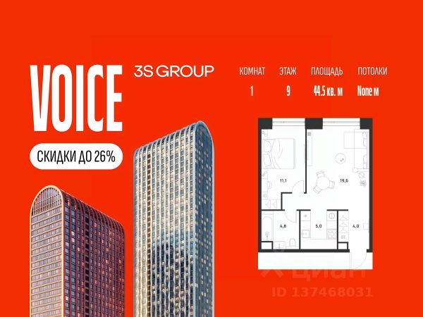 Ипотека от 3,5% на весь срок. Дополнительная скидка в офисе продаж! Продается уютная 1-комн. квартира площадью 44,5 кв.м на 9 этаже жилого комплекса бизнес-класса Войс от 3S Group. Общая площадь: 44,5 кв.м., жилая: 30,7 кв.м., площадь кухни-гостиной: 24,6 кв.м., высокие потолки: 3,12 м., санузел совмещенный. О проекте: Войс. Высокие стандарты жизни Мы уверены, что высокие идеалы неизменно помогают достигать высот. Создавая Войс, мы ориентировались на людей с высокими требованиями к качеству и безупречным вкусом. Башни жилого комплекса, сочетают элегантную форму с динамичной геометрией фасадов, устремляются ввысь и отвечают самым высоким стандартам строительства. Технологичность, воплощенная в архитектуре - это ваш, собственный Войс. Преимущества локации Близость к метро Текстильщики, БКЛ и МЦК Новохохловская (10 мин) Рядом природный заповедник и конно-спортивная база Кузьминки-Люблино Будущее окружение Проект Южный порт - Текстильщики с деловым центром Сити-2 Небоскребы высотой до 300м Культурный центр с амфитеатром Променад вдоль Москвы-реки и яхт-клуб Архитектура Проект от Архитектурной мастерской Алексея Ильина Две перпендикулярные башни с арочными вершинами Высокая башня: светло-серый металл Низкая башня: терракотовая керамика Благоустройство Внешняя зона: парковки, магазины, кафе Внутренний двор: закрытая территория с озеленением Шумозащитный экран Сезонное озеленение Встречи на высоте Гранд-лобби высотой 8м Дизайнерская мебель Умные скоростные лифты Услуги Детский центр с игровой зоной Фитнес-студия для жителей