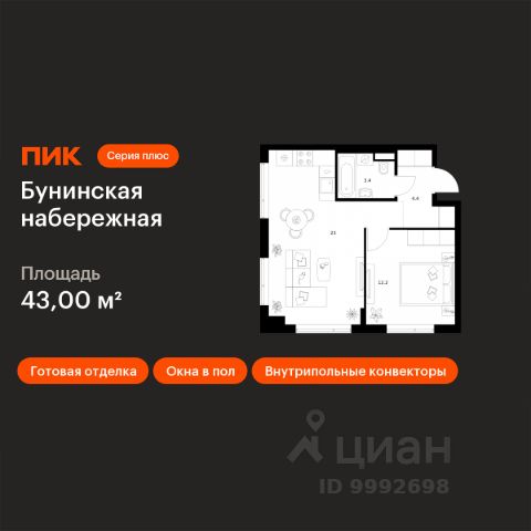 Продается 1-комн. квартира, с отделкой в ЖК "Новые Ватутинки. Квартал у реки".