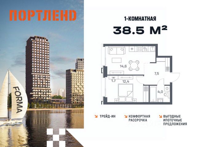 Цены указаны с условием 100% оплаты и стандартной ипотеки. Продаётся 1-к. квартира, 14 этаж в жилом комплексе бизнес-класса ПОРТЛЕНД от девелопера FORMA. ЖК расположен на берегу Москвы-реки в северной части района Печатники в акватории Южного речного порта. Основные преимущества проекта: • Самая протяженная береговая линия реки в Москве 13 км. • Вид на реку в сторону запада панорамные окна на самое широкое водное пространство Москва-реки (900 м) и на закат. • 95% квартир с видом на воду. • К ПОРТЛЕНД не примыкает крупных автомагистралей - отсутствие фонового шума дорог. • В перспективе ближайших 11 лет на территории района запланировано грандиозное преобразование и комплексное развитие. • Собственная набережная длиной 412 м., которая после завершения строительства сомкнется с эко-парком Печатники. • Прямой выход к воде и отсутствие проезжей части между ПОРТЛЕНД и береговой линией. • Инфраструктурное разнообразие: супермаркеты, крупные торговые центры, рестораны, кафе, фитнес-клубы, бьюти-салоны, компании сферы услуг и многое другое. • Собственная школа на 300 мест и детский сад на 275 мест. • Паркинг на 650 м/м • Транспортная вседоступность: метро, авто, велосипед, речной трамвай, канатная дорога • 15 мин. пешком до м. Печатники, 15 мин. на авто до ТТК, 20 минут на авто до Садового кольца