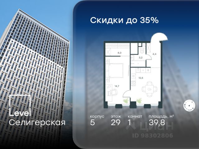 Прямая продажа от застройщика. Продаётся 1-комнатная квартира общей площадью 53.82 м² с предчистовой отделкой в ЖК "Селигер Сити" на 29-м этаже башни Лисицкого. Корпуса четвертой очереди ЖК "Селигер сити" названы в честь трех великих представителей науки и архитектуры, новаторское видение которых — слишком смелое для своего времени — нашло воплощение в уникальных домах жилого комплекса. Вдохновленные авангардными идеями знаменитого советского архитектора Эля Лисицкого, архитекторы создали яркий центр притяжения всего района, задающий новый стандарт жизни в современном мегаполисе — две высокие "Башни Лисицкого" с современной интерпретацией горизонтального небоскреба. Преимущества проекта: - 2 минуты пешком от метро "Селигерская" - Архитектурное решение от голландского бюро MLA + - Одна из самых больших придомовых территорий в Москве - Огороженная охраняемая территория, круглосуточное видеонаблюдение - Европейский подход к благоустройству от бюро Wowhaus: появится парадный бульвар, аллея с фонтаном и арт-объектом, что дополнит уже сформированное благоустройство: детские площадки для разных возрастов, площадки для воркаута, дорожки для бега и пеших прогулок, места для отдыха - Два детских сада, школа начальных классов и центр доп.образования - Искусственный пруд на территории комплекса с благоустроенной набережной и мостом - Продуманная концепция инфраструктуры: уютные кафе и рестораны, супермаркет, магазин фермерских продуктов, бытовые службы, салон красоты, детские сады - Ультрасовременные инженерные решения - Подземный паркинг с зарядными станциями для электромобилей, постами подкачки шин и келлерами - Лобби по индивидуальному дизайн проекту от европейского бюро Вlank Architects: лаунж-зоны, ресепшен, колясочная, помещение для мытья лап животным после прогулки - Надежный девелопер с опытом премиальных проектов MR Расположение комплекса: - 2 минуты от станции метро "Селигерская" - 7 минут на машине до станции метро "Окружная" - Предусмотрен удобный выезд в сторону ТТК (всего 9 км или 15 минут без пробок) - МКАД в 10 минутах на машине Компания MR предлагает своим клиентам специальные условия приобретения квартир в рамках программ ипотечного кредитования от банков-партнеров.