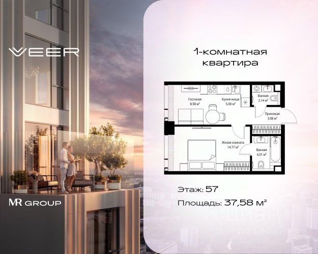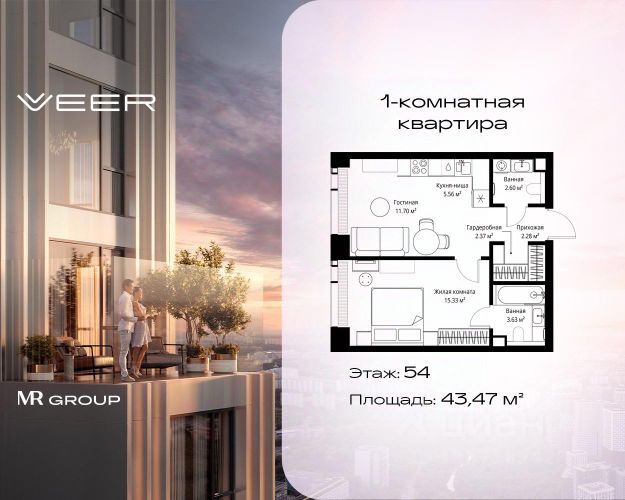 Старт продаж новой очереди! Продаётся 1-комнатная квартира общей площадью 45.77 м² без отделки в ЖК VEER на 57-м этаже 70 этажного дома. VEER.2 — вторая очередь футуристичного квартала бизнес-класса VEER. Это новая экосистема в престижном Западном округе Москвы, поражающая масштабностью внутренней инфраструктуры. ЖК находится всего в 5 минутах от Кутузовского проспекта и в 15 минутах от Сколково. Ансамбль из четырех стеклянных башен с доминантой в 237 метров разработан по принципу современного урбанизма и выражен в лаконичных объемах — параллелепипедах со сглаженными углами, которые придают зданиям утонченный вид. Расположение и транспортная доступность: • Образовательный комплекс в составе топовой школы, состоящий из двух зданий: основное на 1500 школьных и 450 дошкольных мест, отдельное здание детского сада на 300 мест. • Парк "Долина реки Сетунь" площадью более 700 гектаров • Рядом МГУ, МГИМО, РАНХиГС и Академия ФСБ • 15 минут по Кутузовскому проспекту до ужина в центре с видом на Москву-реку • 18 минут пешком до м. "Давыдково" • Открытие новых станций метро в шаговой доступности в будущем Инфраструктура: Двор в VEER.2 — это ассиметричные холмы, каменные "лабиринты", зеленые ковры и хвойные островки с единой живой экосистемой. Здесь есть все: • Павильон умиротворения Место отдыха под навесом в спокойной части двора, окруженное деревьями. • Активная тропа Тактильная дорога из камней разного диаметра для расслабляющих прогулок. • Бизнес-гарден Оборудованное пространство для работы на свежем воздухе со столом и встроенными розетками. • Детская площадка Двухуровневая площадка "Ботаника" с песочницей, переговорной трубой и горкой "Дружба". Компания MR предлагает своим клиентам специальные условия приобретения квартир в рамках программ ипотечного кредитования от банков-партнеров.