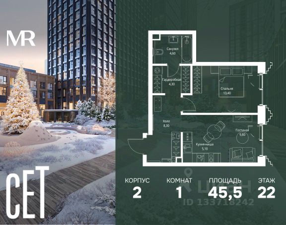 Прямая продажа от застройщика. В ЖК Сет продается 1-комнатная квартира площадью 51.60 м², расположенная в корпусе А, на 45 этаже 52 этажного дома. Сет имеет стратегически выгодное расположение в ЗАО, в районе с большой историей и блестящим будущим: между природной зоной долины реки Сетунь и Кутузовским проспектом. В рамках возведения первой очереди предусмотрено три корпуса высотой 18, 45 и 59 этажей. На верхних этажах спроектированы общедоступные смотровые площадки с панорамным обзором на центр столицы. Преимущества проекта: • Функциональные планировочные решения • Контроль проникновения через входную дверь • Система управления освещением и температурой в квартире • Система защиты от протечек с функцией перекрытия воды • Вход в подъезд по биометрическим считывателям Face ID • Скоростные лифты • Двухуровневый подземный охраняемый паркинг на 495 машино-мест Застройка Сет включает в себя не только жилые корпуса, но и инфраструктурные объекты. Все необходимое для повседневного комфорта будет расположено в шаговой доступности: • Фитнес-клуб с бассейном • Ведущая городская школа, детский сад и школа искусств • Центр культуры и досуга • Медицинский центр • Кафе и рестораны Расположение комплекса: Пешком: • Метро "Давыдково" - 17 минут • Парк "Долина реки Сетунь" - 3 минуты • Открытие новых станций метро в шаговой доступности в будущем Инфраструктура: Разнообразить свой день резиденты Веер смогут также проводя больше времени на свежем воздухе. Двор разделен на 4 зоны разных эмоций и действий, которые пересечены и соединены веерными прогулочными маршрутами: • Спортивная площадка устроена в глубине ""Кленовой рощи"" • В ""Чайном домике"" будет создан навес с утеплением для отдыха в любую погоду • Площадки для детей воплотятся в ""Волшебный лес"" с цветами, зеркалами и световым дизайном • ""Центральная площадь"" устроена у водного оазиса живописного пруда. На машине: • "Москва-Сити" - 15 минут • Садовое кольцо - 20 минут • ТЦ "Океания" - 8 минут • ТЦ "Времена года" - 13 минут • Сколково - 12 минут • Гребной канал - 17 минут Компания MR предлагает своим клиентам специальные условия приобретения квартир в рамках программ ипотечного кредитования от банков-партнеров. Продам 1-комнатную квартиру с отделкой от застройщика в районе Можайский в Москве.