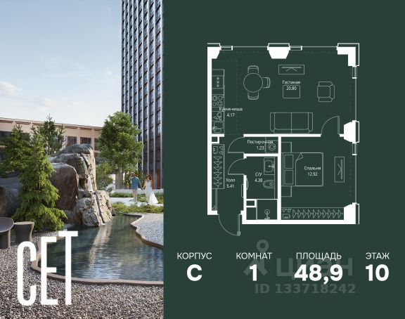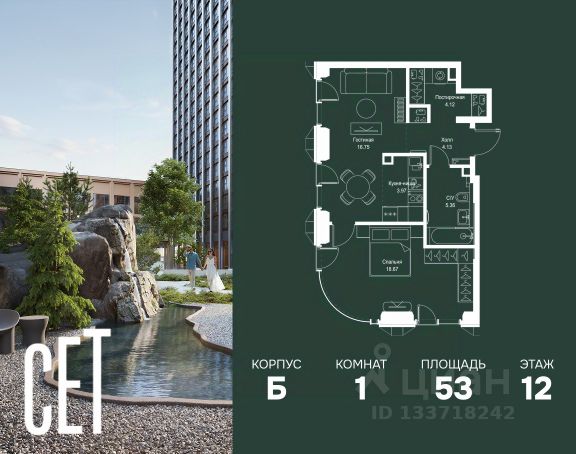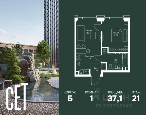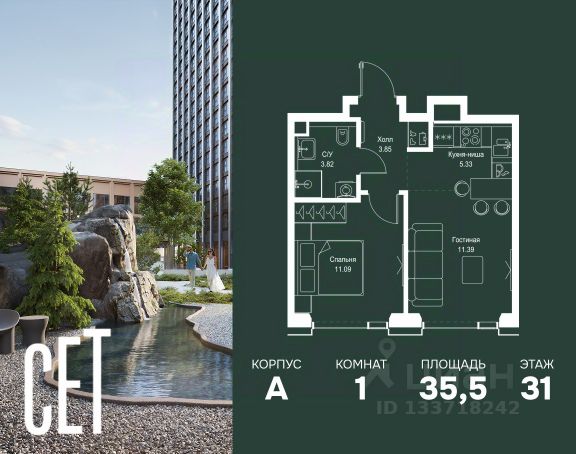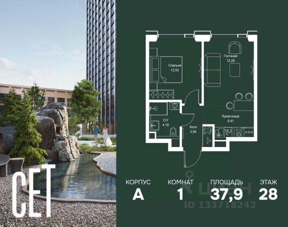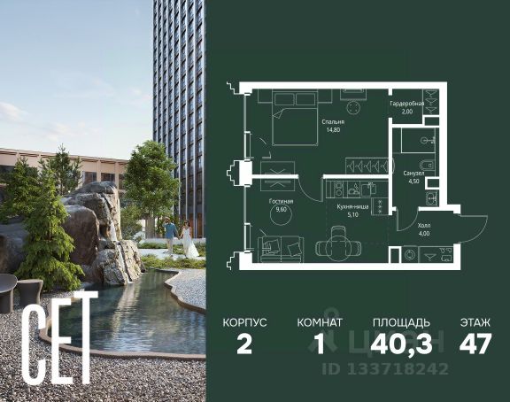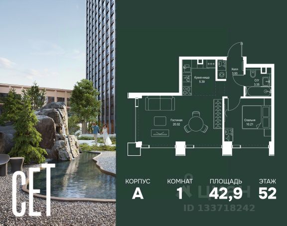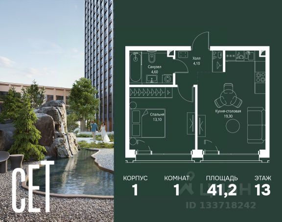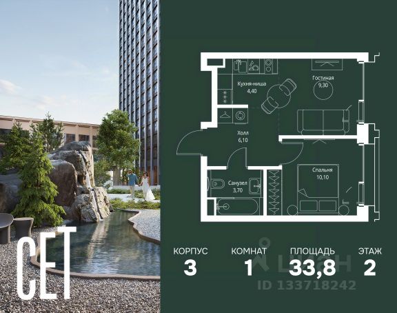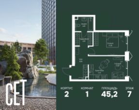 Прямая продажа от застройщика. В ЖК Сет продается 1-комнатная квартира площадью 33.80 м², расположенная в корпусе 3, на 2 этаже 45 этажного дома. Сет имеет стратегически выгодное расположение в ЗАО, в районе с большой историей и блестящим будущим: между природной зоной долины реки Сетунь и Кутузовским проспектом. В рамках возведения первой очереди предусмотрено три корпуса высотой 18, 45 и 59 этажей. На верхних этажах спроектированы общедоступные смотровые площадки с панорамным обзором на центр столицы. Преимущества проекта: • Функциональные планировочные решения • Контроль проникновения через входную дверь • Система управления освещением и температурой в квартире • Система защиты от протечек с функцией перекрытия воды • Вход в подъезд по биометрическим считывателям Face ID • Скоростные лифты • Двухуровневый подземный охраняемый паркинг на 495 машино-мест Застройка Сет включает в себя не только жилые корпуса, но и инфраструктурные объекты. Все необходимое для повседневного комфорта будет расположено в шаговой доступности: • Фитнес-Клуб с бассейном • Ведущая городская школа, детский сад и школа искусств • Центр культуры и досуга • Медицинский центр • Кафе и рестораны Расположение комплекса: Пешком: • Метро "Давыдково" - 17 минут • Парк "Долина реки Сетунь" - 3 минуты • Открытие новых станций метро в шаговой доступности в будущем Инфраструктура: Разнообразить свой день резиденты Веер смогут также проводя больше времени на свежем воздухе. Двор разделен на 4 зоны разных эмоций и действий, которые пересечены и соединены веерными прогулочными маршрутами: • Спортивная площадка устроена в глубине ""Кленовой рощи"" • В ""Чайном домике"" будет создан навес с утеплением для отдыха в любую погоду • Площадки для детей воплотятся в ""Волшебный лес"" с цветами, зеркалами и световым дизайном • ""Центральная площадь"" устроена у водного оазиса живописного пруда. На машине: • "Москва-Сити" - 15 минут • Садовое кольцо - 20 минут • ТЦ "Океания" - 8 минут • ТЦ "Времена года" - 13 минут • Сколково - 12 минут • Гребной канал - 17 минут Компания MR предлагает своим клиентам специальные условия приобретения квартир в рамках программ ипотечного кредитования от банков-партнеров. Продам 1-комнатную квартиру с отделкой от застройщика в районе Можайский в Москве.