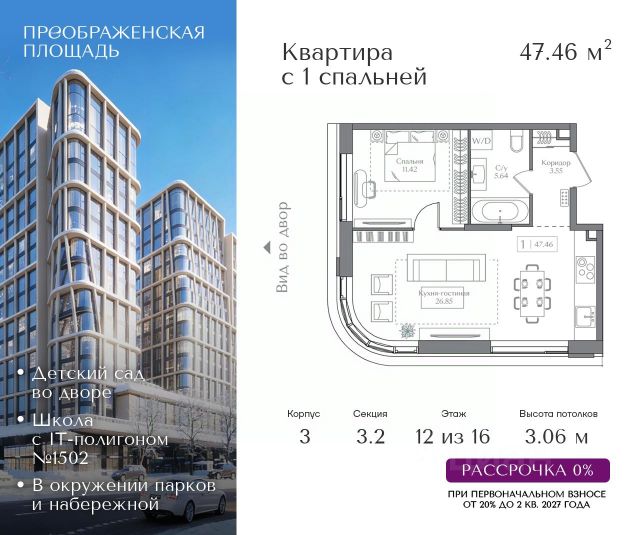 Квартира на 8 этаже в жилом комплексе премиум-класса "Преображенская площадь". Общая площадь: 37.8 кв.м. Проект премиум-класса в историческом районе Москвы. До метро "Преображенская площадь" 3 минуты пешком. Квартиры сдаются без отделки и в свободной планировке, чтобы жители могли оформить пространство с учетом своей индивидуальности. Высота потолков от 3,15м, широкоформатное остекление, 3-5 квартир на этаже. Система Умный дом. Дизайнерские лобби. Внутренний двор 1,5 га функциональное и безопасное пространство для игр, работы и занятий спортом. Пешеходный променад для прогулок. Дома переменной этажности. Есть подземный паркинг. Жилой комлекс находится в окружении парков Сокольники, Черкизовский, Измайловский, заповедника Лосиный остров и ВДНХ, а также вблизи пешеходной набережной. Комфортная удаленность от центра: 7 минут на автомобиле до ТТК, 8 минут до Садового кольца, 25 минут до Кремля. Купить 1-комнатную квартиру с отделкой от застройщика в районе Преображенское в Москве.