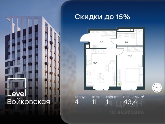 Цена указана с учётом скидки при 100%-й оплате, несубсидированной ипотеке, рассрочке (кроме программы "Рассрочка 0%"). Продается 1-комнатная квартира площадью 42.30 кв. м без отделки. Квартира находится на 3 этаже 20-этажного корпуса 3, в новом жилом комплексе бизнес-класса Level Войковская, расположенном рядом с живописным заповедником "Покровское-Стрешнево" (застройщик - компания Level Group/Левел групп). Прекрасная транспортная доступность - 7 мин. пешком до станции МЦК "Балтийская"; - 15 мин. пешком до станции метро "Войковская"; - 8 мин. на машине до ТТК; - 15 мин. на машине до центра Москвы; - 20 мин. на машине до Москва-Сити. Продуманный архитектурный проект - стильная архитектура от мастерской Фефелова В. В.; - панорамные виды на парки, Химкинское водохранилище и Останкинскую башню; - лобби с высотой потолков до 6,45 метров; - более 20 видов планировочных решений, включая редкие форматы квартир с террасой и увеличенной высотой потолков до 5,42 метров; - 2 варианта дизайнерской отделки в корпусе 4, предлагаются как дополнительная опция к отделке white box: стиль Modern в светлых холодных тонах и стиль Classic в нейтральной бежевой гамме. Квартиры в корпусах 3 и 5 сдаются без отделки. Расположение Level Войковская строится в престижном Северном округе Москвы. Развитая инфраструктура и живописная природа переплетаются в единый ансамбль, столь значимый для комфортной жизни. Войковский район окружают парки и набережные. В шаговой доступности - парк "Покровское-Стрешнево", не более 15-ти минут на велосипеде занимает путь до Тимирязевского парка и 9-ти минут до парка усадьбы Михалково. Рядом более 60 школ, 75 дошкольных учреждений, 17 государственных и 6 частных вузов, 25 супермаркетов, 4 торговых центра, среди которых ТЦ "Метрополис" и ТЦ "Авиапарк". Внутренняя инфраструктура На территории жилого комплекса предусмотрены коммерческие помещения: кафе, ресторан, пекарня и другие сервисы откроются на первых этажах корпусов. Для жителей будет доступен отапливаемый подземный паркинг на 244 машино-места с доступом с любого этажа на лифте. На территории паркинга будет расположено 125 кладовых помещений для хранения сезонного инвентаря. Лобби и благоустройство Дизайн лобби Level Войковская создан совместно с бюро BLANK. Это уютные гостиные, где хочется задержаться. Теплая цветовая гамма, ресепшен, зоны ожидания, лапомойки и гостевые санузлы - каждая деталь превращает лобби в комфортное продолжение вашего дома. 1,15 га площади в первых двух этапах строительства отведено под приватный внутренний двор, который спроектирован совместно с бюро "Правда". Детские площадки для всех возрастов, спортивные пространства для йоги, воркаута и петанка, уютные зоны для тихого отдыха или работы. Здесь утро начинается с вдохновения, а вечер наполнен приятными моментами. Лифты Комфортное перемещение внутри жилого комплекса будут обеспечивать надёжные лифты с доступом в паркинг с жилых этажей. В каждом корпусе предусмотрено по 3 грузопассажирских лифта. Купить 1-комнатную квартиру с отделкой от застройщика станция Балтийская (МЦК).